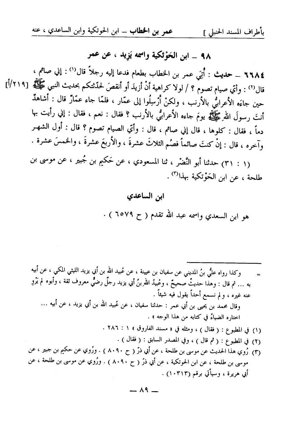 6684 - حديث: أتي عمر بن الخطاب بطعام فدعا إليه رجلا قال: إني صائم، قال: وأي صيام تصوم؟ لولا كراهية أن أزيد أو أنقص لحدثتكم بحديث النبي صَلَّى اللَّهُ عَلَيْهِ وَسَلَّمَ حين جاءه الأعرابي بالأرنب، ولكن أرسلوا إلى عمار، فلما جاء عمار قال: أشاهد أنت رسول الله صَلَّى اللَّهُ عَلَيْهِ وَسَلَّمَ يوم جاءه الأعرابي بالأرنب؟ فقال: نعم، فقال: إني رأيت بها دما، فقال: كلوها، قال إني صائم، قال: وأي الصيام تصوم؟ قال: أول الشهر وآخره، قال: إن كنت صائما فصم الثلاث عشرة، والأربع عشرة، والخمس عشرة. (1: 31) حدثنا أبو النضر، ثنا المسعودي، عن حكيم بن جبير، عن موسى بن طلحة، عن ابن الحوتكية بهذا. ابن الساعدي هو ابن السعدي واسمه عبد الله تقدم (ح -[90]- 6579) . ابن السمط هو شرحبيل تقدم (ح 6566) .