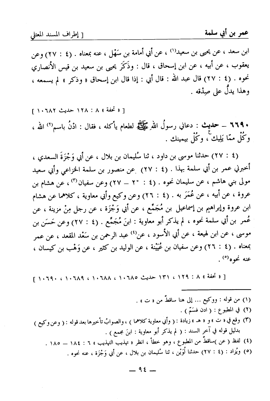 6690 -[ع] حديث: دعاني رسول الله صَلَّى اللَّهُ عَلَيْهِ وَسَلَّمَ لطعام يأكله، فقال: ادن باسم الله، وكل مما يليك، وكل بيمينك. (4: 27) حدثنا موسى بن داود، ثنا سليمان بن بلال، عن أبي وجزة السعدي، أخبرني عمر بن أبي سلمة بهذا. (4: 27) عن منصور بن سلمة الخزاعي وأبي سعيد مولى بني هاشم، عن سليمان نحوه. (4: 26 - 27) وعن سفيان، عن هشام بن عروة، عن أبيه، عن عمر به. (4: 26) وعن وكيع وأبي معاوية، كلاهما عن هشام بن عروة وإبراهيم بن إسماعيل بن مجمع، عن أبي وجزة، عن رجل من مزينة، عن عمر بن أبي سلمة نحوه، لم يذكر أبو معاوية: ابن مجمع. (4: 27) وعن حسن بن موسى، عن ابن لهيعة، عن أبي الأسود، عن عبد الرحمن بن سعد المقعد، عن عمر بمعناه. (4: 26) وعن سفيان بن عيينة، عن الوليد بن كثير، عن وهب بن كيسان، عنه نحوه.