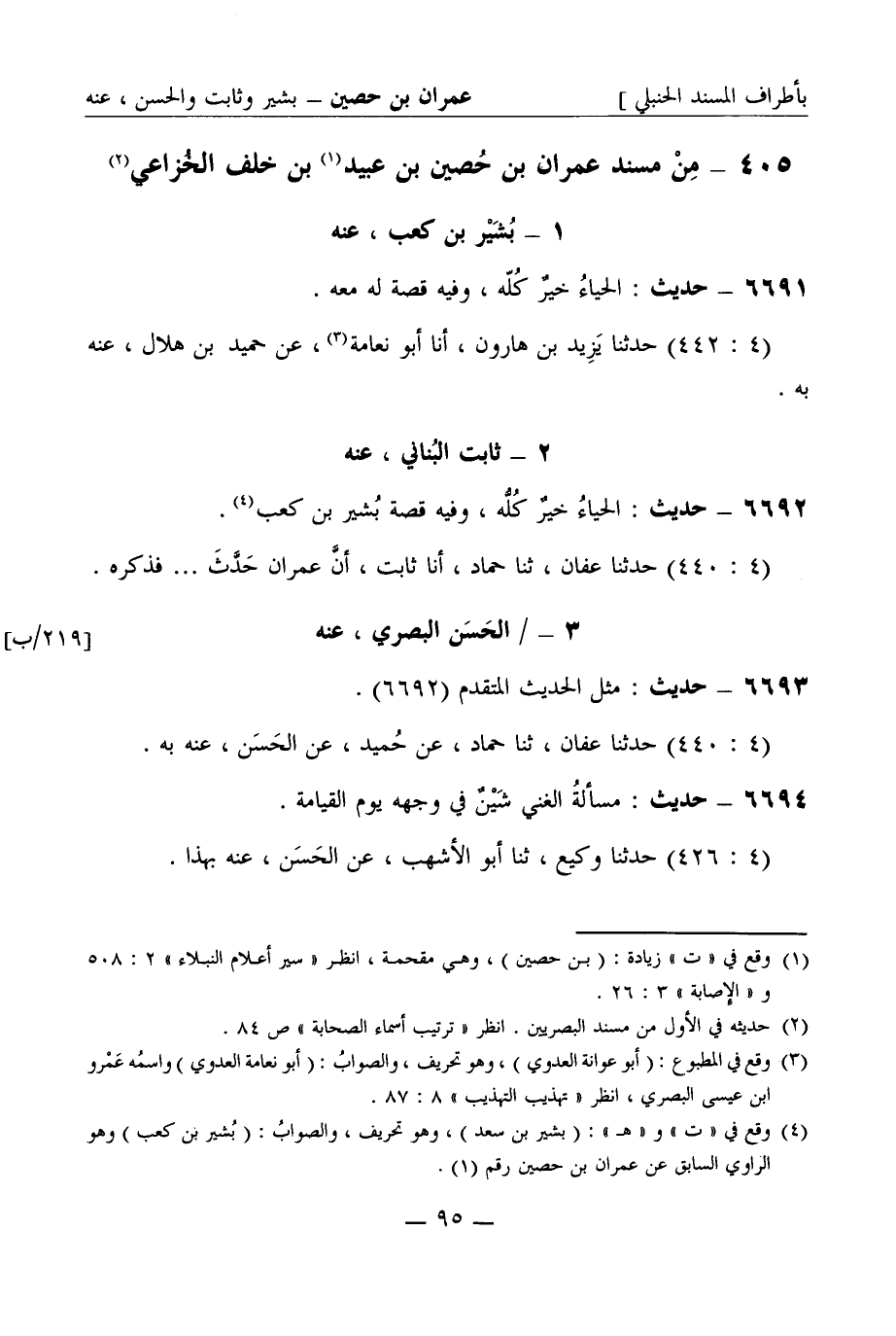 6692 - حديث: الحياء خير كله، وفيه قصة بشير بن كعب. (4: 440) حدثنا عفان، ثنا حماد، أنا ثابت، أن عمران حدث ... فذكره.