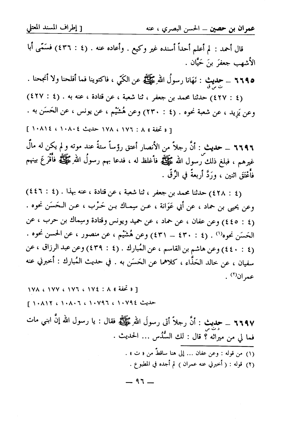 6696 -[س] حديث: أن رجلا من الأنصار أعتق رؤوسا ستة عند موته ولم يكن له مال غيرهم، فبلغ ذلك رسول الله صَلَّى اللَّهُ عَلَيْهِ وَسَلَّمَ فأغلظ له، فدعا بهم رسول الله صَلَّى اللَّهُ عَلَيْهِ وَسَلَّمَ فأقرع بينهم فأعتق اثنين، ورد أربعة في الرق. (4: 428) حدثنا محمد بن جعفر، ثنا شعبة، عن قتادة، عنه بهذا. (4: 446) وعن يحيى بن حماد، عن أبي عوانة، عن سماك بن حرب، عن الحسن نحوه. (4: 445) وعن عفان، عن حماد عن حميد ويونس وقتادة وسماك بن حرب، عن الحسن نحوه. (4: 430 - 431) وعن هشيم، عن منصور، عن الحسن نحوه. (4: 440) وعن هاشم بن القاسم، عن المبارك. (4: 439) وعن عبد الرزاق، عن سفيان، عن خالد الحذاء، كلاهما عن الحسن به. في حديث المبارك: أخبرني عنه عمران.