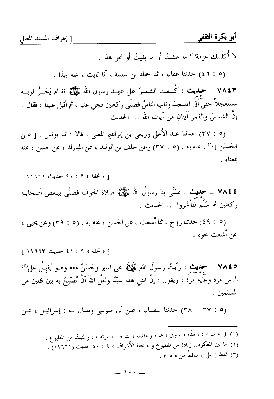 7845 -[خ د ت س] حديث: رأيتُ رسولَ اللهِ صَلَّى اللَّهُ عَلَيْهِ وَسَلَّمَ على المنبر وحَسَنٌ معه وهو يُقْبِلُ على الناس مرة وعليه مرة، ويقول: إنَّ ابني هذا سَيّدٌ ولعلَّ اللهَ أن يُصْلِحَ به بين فئتين من المسلمين. (5: 37 - 38) حَدَّثَنا سفيان، عن أبي موسى ويُقال له: إسرائيل، عن -[101]- الحَسَن، عنه به. (5: 47) وعن عبد الرزاق، عن مَعْمَر، عمّن سَمِعَ الحَسَنَ نحوه. (5: 49) وعن مُؤمّل، عن حمّاد بن زيد، عن علي بن زيد، عن الحَسَن أتمّ منه. (5: 51، 44) وعن عفان وهاشم، عن مبارك، عن الحَسَن بمعناه.