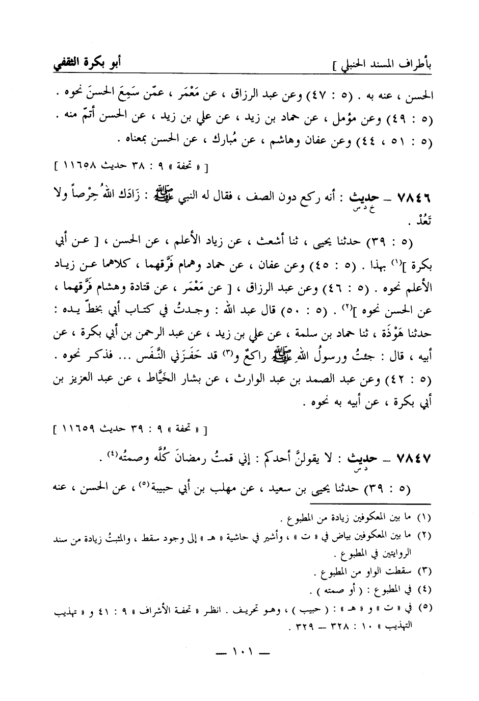 7846 -[خ د س] حديث: أنه ركع دون الصف، فقال له النبيّ صَلَّى اللَّهُ عَلَيْهِ وَسَلَّمَ: زَادَك اللهُ حِرْصاً ولا تَعُدْ. (5: 39) حَدَّثَنا يحيى، ثنا أشعث، عن زياد الأعلم، عن الحَسَن، [عن أبي بَكْرة] بهذا. (5: 45) وعن عفان، عن حمّاد وهَمَّام فَرَّقَهما، كلاهما عن زياد الأعلم نحوه. (5: 46) وعن عبد الرزاق، [عن مَعْمَر، عن قَتَادة وهشام فَرَّقَهما، عن الحَسَن نحوه] (5: 50) قال عبد الله: وجدتُ في كتاب أبي بخطِّ يده: حَدَّثَنا هَوْذَة، ثنا حمّاد بن سَلَمة، عن علي بن زيد، عن عبد الرحمن بن أبي بَكْرة، عن أبيه، قال: جئتُ ورسولُ الله صَلَّى اللَّهُ عَلَيْهِ وَسَلَّمَ راكعٌ وقد حَفَزَني النَّفَس ... فذكر نحوه. (5: 42) وعن عبد الصمد بن عبد الوارث، عن بشار الخَيَّاط، عن عبد العزيز بن أبي بَكْرة، عن أبيه به نحوه.