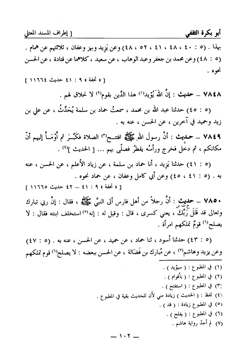7850 -[خ ت س] حديث: أنَّ رجلاً من أهل فارس أتى النبيَّ صَلَّى اللَّهُ عَلَيْهِ وَسَلَّمَ، فقال: إنَّ رَبّي تبارك وتعالى قد قَتَلَ رَبَّك، يعني كِسْرى، قال: وقيل له: إنه استخلف ابنته فقال: لا يصلح قومٌ تملكهم امرأة. (5: 43) حَدَّثَنا أسود، ثنا حمّاد، عن حميد، عن الحَسَن، عنه به. (5: 47) وعن يزيد وهاشم، عن مبارك بن فَضَالة، عن الحَسَن ببعضه: لا يصلح قوم تملكهم -[103]- امرأة. (5: 38، 47) وعن يحيى ومحمد بن بكر، كلاهما عن عُيَينة بن عبد الرحمن، عن أبيه، عن أبي بَكْرة مختصراً بلفظ: لن يفلح قومٌ أسندوا أَمْرَهم إلى امرأة. (5: 50) قال عبد الله: وجدتُ في كتاب أبي بخطِّه: ثنا هَوْذَة، ثنا حمّاد، عن علي بن زيد، عن عبد الرحمن بن أبي بَكْرة، عن أبيه نحوه.