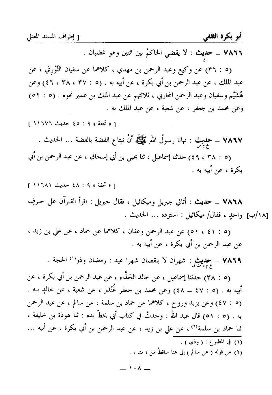 7869 -[خ م د ت ق] حديث: شَهْرَان لا ينقصان شَهْرَا عيد: رمضان وذو الحجّة. (5: 38) حَدَّثَنا إسماعيل، عن خالد الحَذَّاء، عن عبد الرحمن بن أبي بَكْرة، عن أبيه به. (5: 47 - 48) وعن محمد بن جعفر غُنْدَر، عن شُعبة، عن خالدٍ به. (5: 47) وعن يزيد ورَوْح، كلاهما عن حمّاد بن سَلَمة، عن سالم، عن عبد الرحمن به. (5: 51) قال عبد الله: وجدتُ في كتاب أبي بخطِّ يده: ثنا هَوْذَة بن خليفة، ثنا حمّاد بن سَلَمة، عن علي بن زيد، عن عبد الرحمن بن أبي بَكْرة، عن أبيه ... . -[109]- فذكر أحاديث هذا فيها.