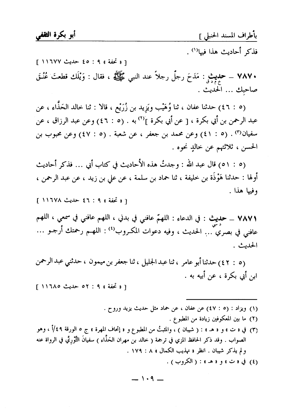 7870 -[خ م د ق] حديث: مَدَحَ رجلٌ رجلاً عند النبيّ صَلَّى اللَّهُ عَلَيْهِ وَسَلَّمَ فقال: وَيْلَك قطعتَ عُنُقَ صاحبِك ... الحديث. (5: 46) حَدَّثَنا عفان، ثنا وُهَيْب ويزيد بن زُرَيْع، قالا: ثنا خالد الحَذَّاء، عن عبد الرحمن بن أبي بَكْرة، [عن أبي بَكْرة] به. (5: 46) وعن عبد الرزاق، عن سفيان. (5: 41) وعن محمد بن جعفر، عن شُعبة. (5: 47) وعن محبوب بن الحَسَن، ثلاثتهم عن خالدٍ نحوه. (5: 51) قال عبد الله: وجدتُ هذه الأحاديث في كتاب أبي ... فذكر أحاديث أولها: حَدَّثَنا هَوْذَة بن خليفة، ثنا حمّاد بن سَلَمة، عن علي بن زيد، عن عبد الرحمن، وفيها هذا.