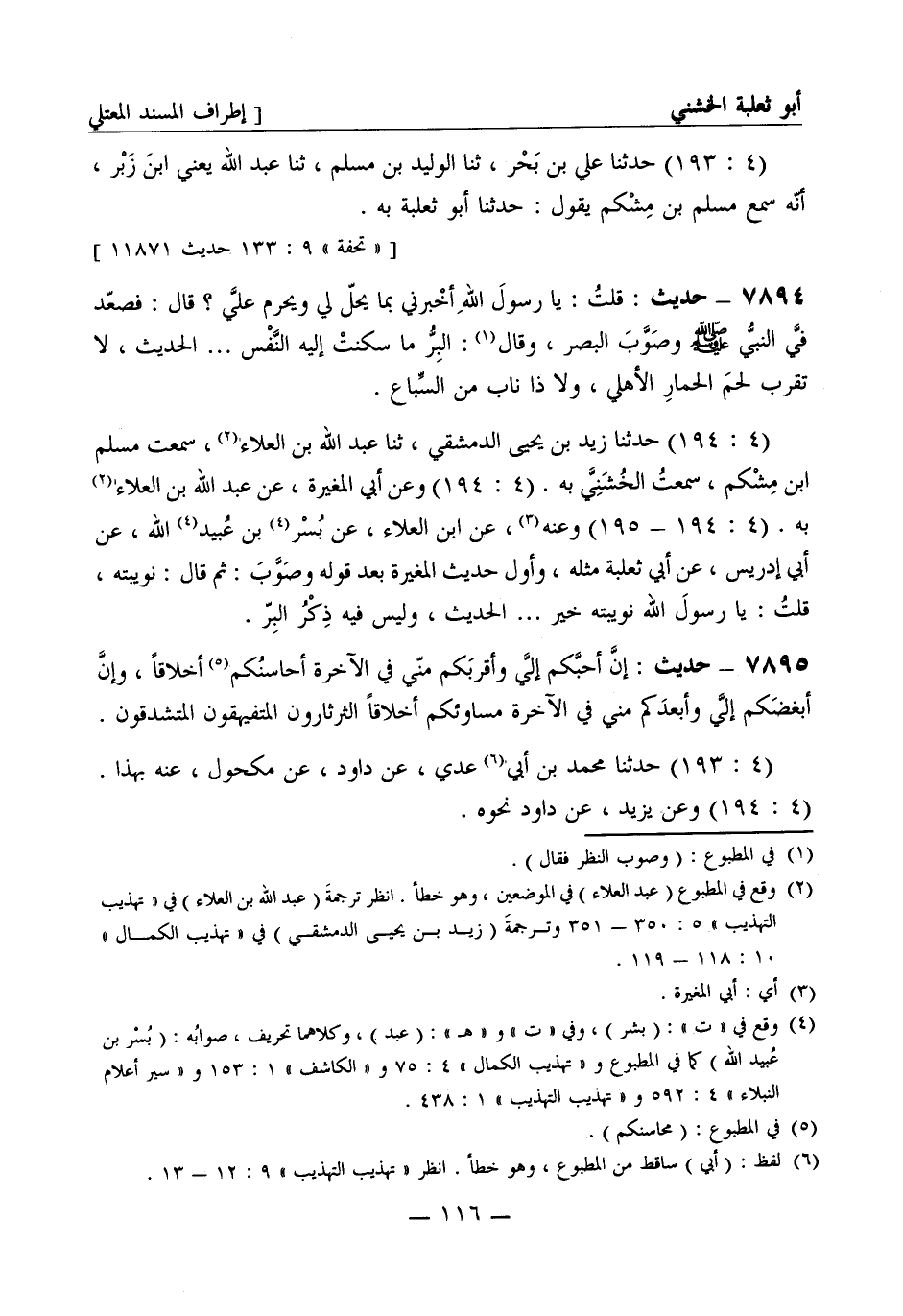 7894 - حديث: قلت: يا رسولَ الله أخبرني بما يحلّ لي ويحرم عليَّ؟ قال: فصعّد فيَّ النبيُّ صَلَّى اللَّهُ عَلَيْهِ وَسَلَّمَ وصَوَّبَ البصر، وقال: البِرُّ ما سكنتْ إليه النَّفْس ... الحديث، لا تقرب لحمَ الحمارِ الأهلي، ولا ذا ناب من السِّباع. (4: 194) حَدَّثَنا زيد بن يحيى الدمشقي، ثنا عبد الله بن العلاء، سمعت مسلم بن مِشْكم، سمعتُ الخُشَنِيّ به. (4: 194) وعن أبي المغيرة، عن عبد الله بن العلاء به. (4: 194 - 195) وعنه، عن ابن العلاء، عن بُسَر بن عُبَيد الله، عن أبي إدريس، عن أبي ثَعْلبة مثله، وأول حديث المغيرة بعد قوله وصَوَّبَ: ثم قال: نويبته، قلت: يا رسولَ الله نويبته خير ... الحديث، وليس فيه ذِكْرُ البِرّ.