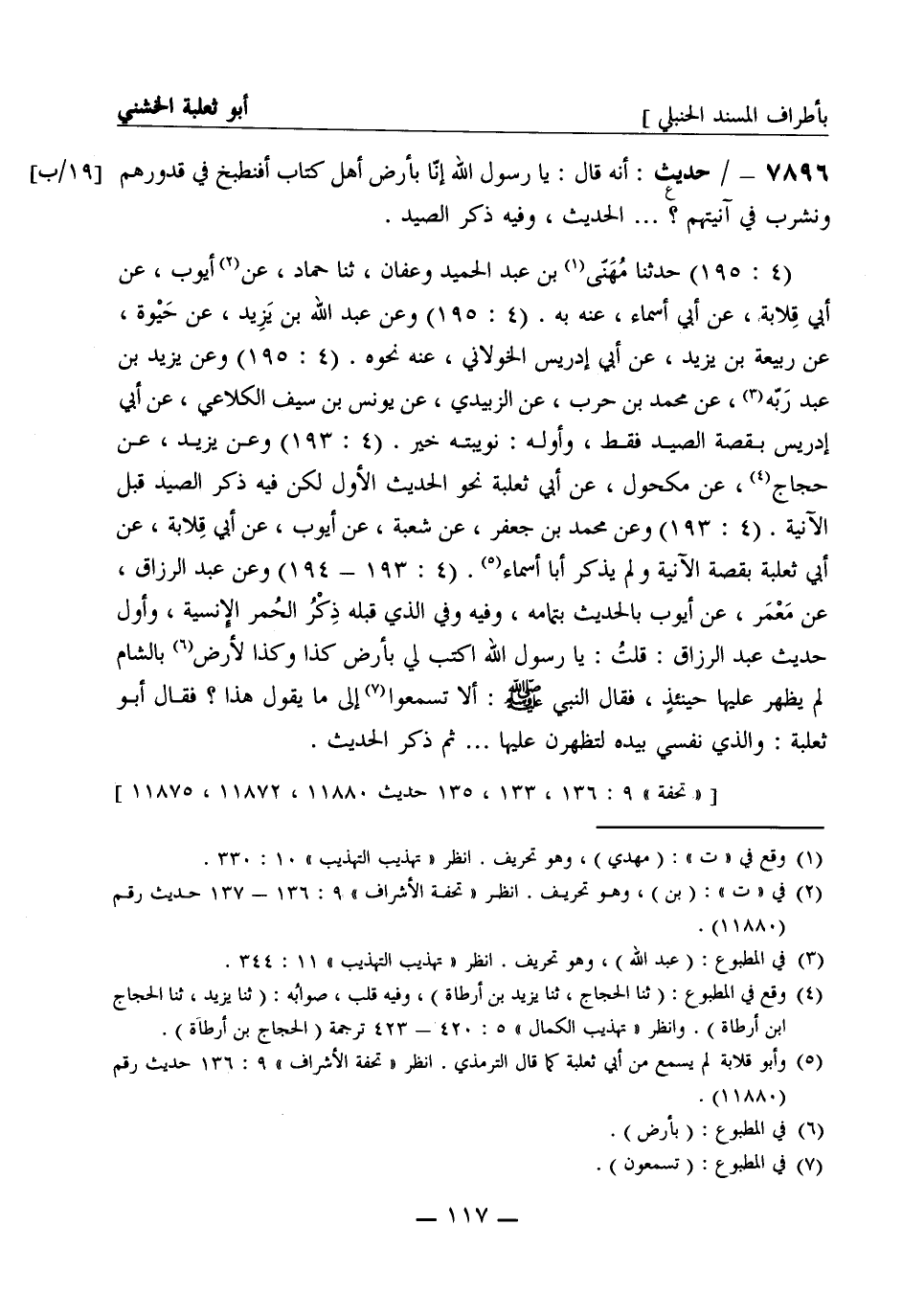 7896 -[ع] حديث: أنه قال: يا رسول الله إنّا بأرض أهل كتاب أفنطبخ في قدورهم ونشرب في آنيتهم؟ ... . الحديث، وفيه ذكر الصيد. (4: 195) حَدَّثَنا مُهَنّى بن عبد الحميد وعفان، ثنا حمّاد، عن أيوب، عن أبي قِلابة، عن أبي أسماء، عنه به. (4: 195) وعن عبد الله بن يزيد، عن حيوه، عن ربيعة بن يزيد، عن أبي إدريس الخولاني، عنه نحوه. (4: 195) وعن يزيد بن عبد رَبِّه، عن محمد بن حَرْب، عن الزبيدي، عن يونس بن سيف الكلاعي، عن أبي إدريس بقصة الصيد فقط، وأوله: نويبته خير. (4: 193) وعن يزيد، عن حجاج، عن مكحول، عن أبي ثَعْلبة نحو الحديث الأول لكن فيه ذكر الصيد قبل الآنية. (4: 193) وعن محمد بن جعفر، عن شُعبة، عن أيوب، عن أبي قِلابة، عن أبي ثَعْلبة بقصة الآنية ولم يذكر أبا أسماء. (4: 193 - 194) وعن عبد الرزاق، عن مَعْمَر، عن أيوب بالحديث بتمامه، وفيه وفي الذي قبله ذِكْرُ الحُمر الإنسية، وأول حديث عبد الرزاق: قلت: يا رسول الله اكتب لي بأرض كذا وكذا لأرض بالشام لم يظهر عليها حينئذٍ، فقال النبيّ صَلَّى اللَّهُ عَلَيْهِ وَسَلَّمَ: ألا تسمعوا إلى ما يقول هذا؟ فقال أبو ثَعْلبة: والذي نَفْسي بيده لتظهرن عليها ... ثم ذكر الحديث -[118]-.