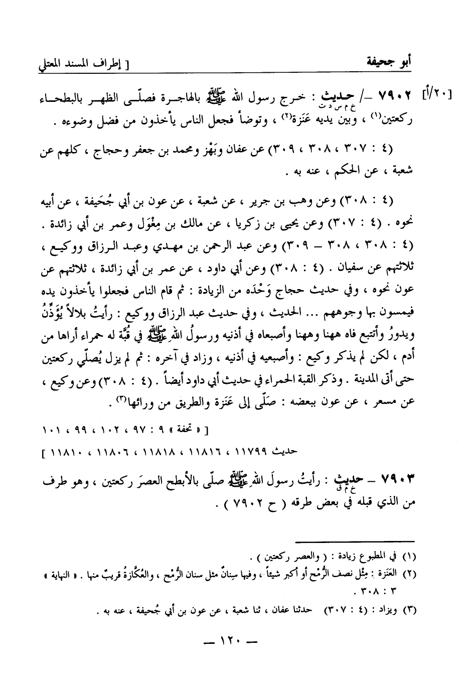 7902 - (خ م س د ت) حديث: خرج رسول الله صَلَّى اللَّهُ عَلَيْهِ وَسَلَّمَ بالهاجرة فصَلّى الظُّهْر بالبطحاء ركعتين، وبين يديه عَنَزة، وتوضأ فجعل الناس يأخذون من فضل وضوءه. (4: 307، 308، 309) عن عفان وبَهْز ومحمد بن جعفر وحجاج، كُلّهم عن شُعبة، عن الحكم، عنه به. (4: 308) وعن وَهْب بن جَرِير، عن شُعبة، عن عَوْن بن أبي جُحَيْفة، عن أبيه نحوه. (4: 307) وعن يحيى بن زكريا، عن مالك بن مِغْوَل وعمر بن أبي زائدة. (4: 308، 308 - 309) وعن عبد الرحمن بن مهدي وعبد الرزاق ووكيع، ثلاثتهم عن سفيان. (4: 308) وعن أبي داود، عن عمر بن أبي زائدة، ثلاثتهم عن عَوْن نحوه، وفي حديث حجاج وَحْدَه من الزيادة: ثم قام الناس فجعلوا يأخذون يده فيمسون بها وجوههم ... . الحديث، وفي حديث عبد الرزاق ووكيع: رأيت بلالاً يُؤَذِّنُ ويدورُ وأتتبع فاه ههنا وههنا وأصبعاه في أُذُنْيَه ورسولُ الله صَلَّى اللَّهُ عَلَيْهِ وَسَلَّمَ في قُبَّة له حمراء أراها من أدم، لكن لم يذكر وكيع: وأصبعيه في أُذُنْيَه، وزاد في آخره: ثم لم يزل يُصَلّي ركعتين حتى أتى المدينة. وذكر القُبَّة الحمراء في حديث أبي داود أيضاً. (4: 308) وعن وكيع، عن مِسْعَر، عن عَوْن ببعضه: صَلّى إلى عَنَزة والطريق من ورائها.