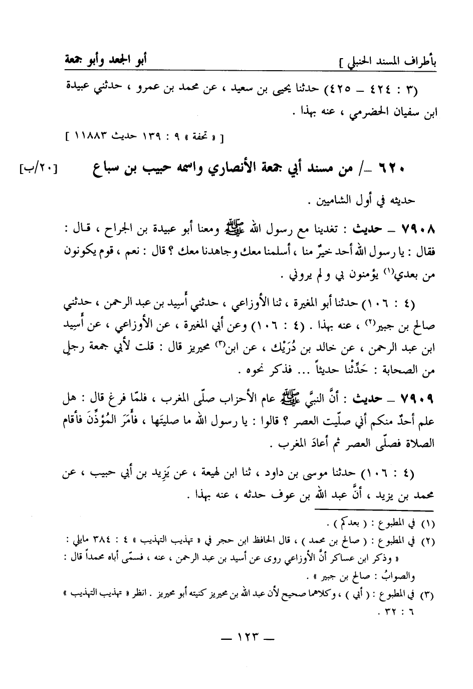 7908 - حديث: تغدينا مع رسول الله صَلَّى اللَّهُ عَلَيْهِ وَسَلَّمَ ومعنا أبو عُبَيدة بن الجَرَّاح، قال: فقال: يا رسول الله أحد خيرٌ منا، أسلمنا معك وجاهدنا معك؟ قال: نعم، قوم يكونون من بعدي يؤمنون بي ولم يروني. (4: 106) حَدَّثَنا أبو المغيرة، ثنا الأوزاعي، حَدَّثَني أَسِيد بن عبد الرحمن، حَدَّثَني صالح بن جُبَير، عنه بهذا. (4: 106) وعن أبي المغيرة، عن الأوزاعي، عن أَسِيد بن عبد الرحمن، عن خالد بن دُرَيْك، عن ابن مُحيريز قال: قلت لأبي جمعة رجلٍ من الصحابة: حَدِّثْنا حديثاً ... فذكر نحوه.