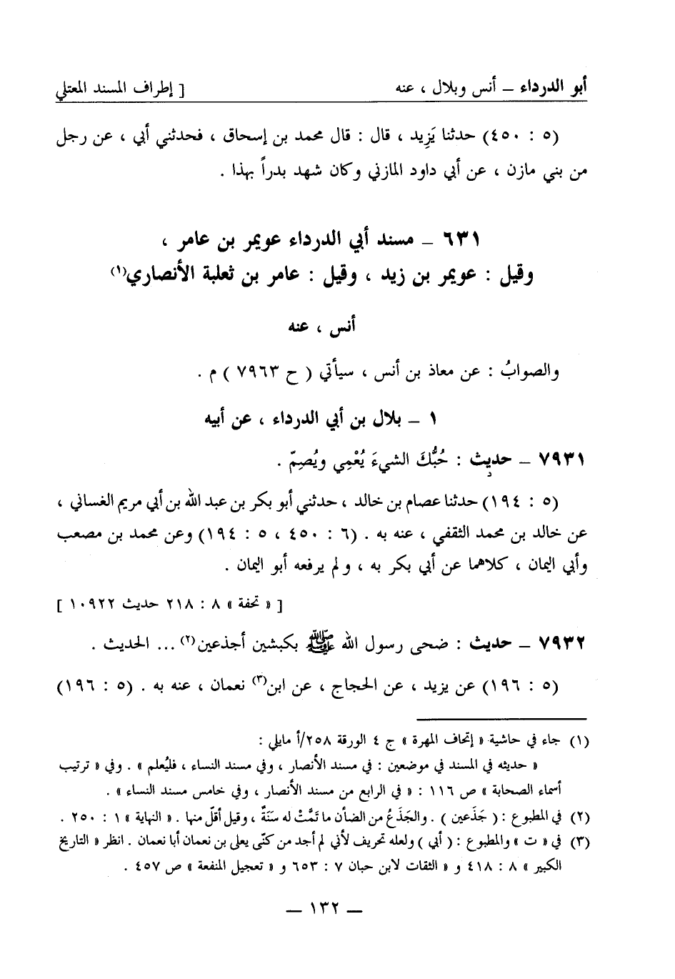 مسند أبي الدرداء عويمر بن عامر، وقيل: عويمر بن زيد، وقيل: عامر بن ثعلبة الأنصاري أنس، عنه. والصواب: عن معاذ بن أنس، سيأتي (ح 7963) م.