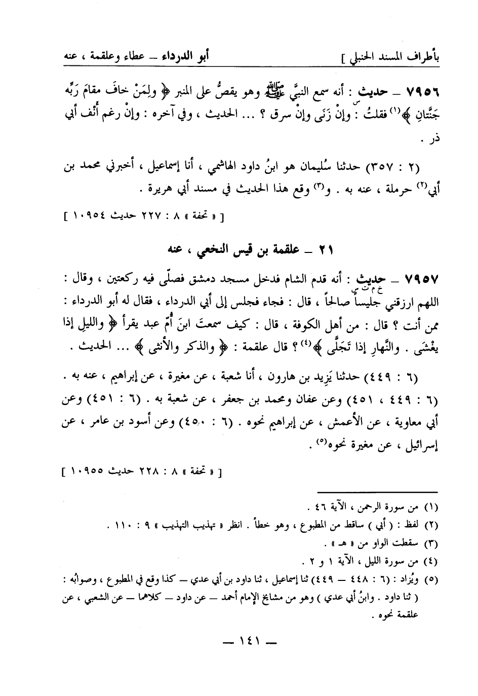 7957 -[خ م ت س] حديث: أنه قدم الشام فدخل مسجد دمشق فصَلّى فيه ركعتين، وقال: اللهمَّ ارزقني جليساً صالحاً، قال: فجاء فجلس إلى أبي الدرداء، فقال له أبو الدرداء: ممّن أنت؟ قال: من أهل الكوفة، قال: كيف سمعتَ ابنَ أُمّ عبد يقرأ وَاللَّيْلِ إِذَا يَغْشَى. وَالنَّهَارِ إِذَا تَجَلَّى؟ قال علقمة: والذَّكَرَ وَالأُنثَى ... الحديث. (6: 449) حَدَّثَنا يزيد بن هارون، أنا شُعبة، عن مغيرة، عن إبراهيم، عنه به. (6: 449، 451) وعن عفان ومحمد بن جعفر، عن شُعبة به. (6: 451) وعن أبي معاوية، عن الأعمش، عن إبراهيم نحوه. (6: 450) وعن أسود بن عامر، عن إسرائيل، عن مغيرة نحوه.