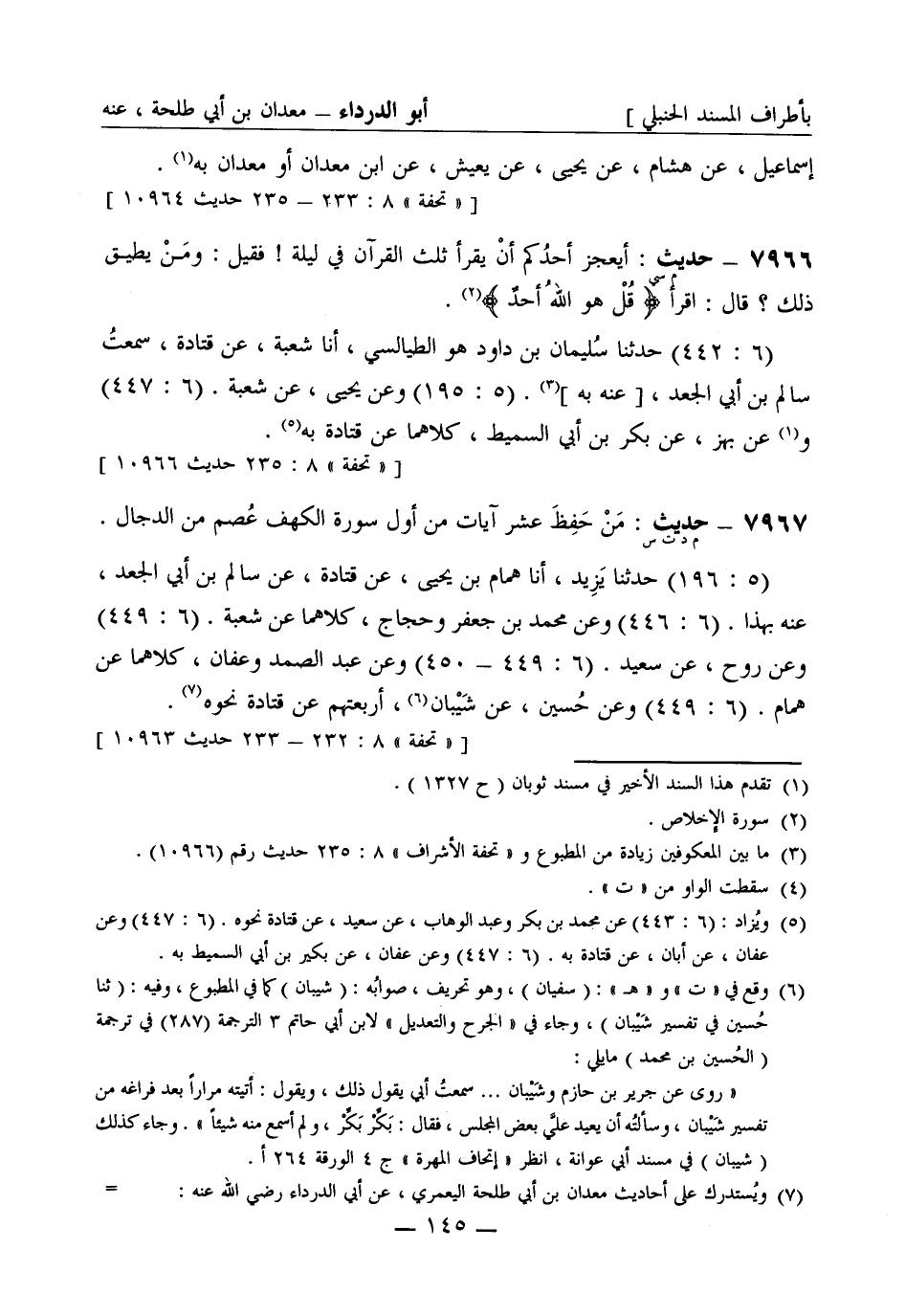 7967 -[م د ت س] حديث: من حَفِظَ عشر آيات من أول سورة الكهف عُصم من الدجَّال. (5: 196) حَدَّثَنا يزيد، أنا همام بن يحيى، عن قَتَادة، عن سالم بن أبي الجَعْد، عنه بهذا. (6: 446) وعن محمد بن جعفر وحجاج، كلاهما عن شُعبة. (6: 449) وعن رَوْح، عن سعيد. (6: 449 - 450) وعن عبد الصمد وعفان، كلاهما عن هَمَّام. (6: 449) وعن حُسَين، عن شَيْبان، أربعتهم عن قَتَادة نحوه.