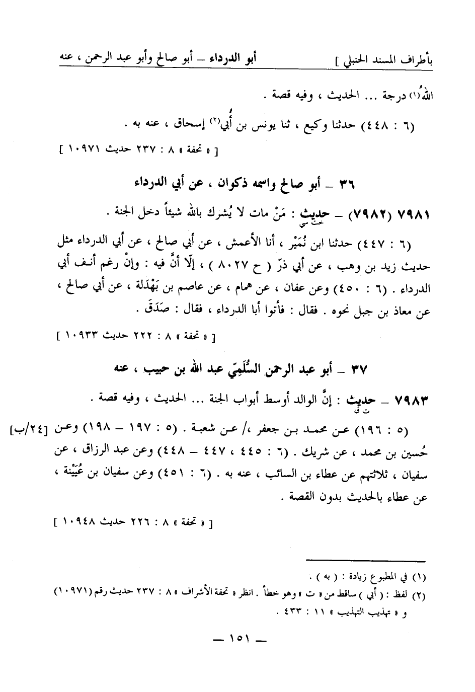 7981 - (7982) - (خت سي) حديث: من مات لا يُشرك بالله شيئاً دخل الجَنَّة. (6: 447) حَدَّثَنا ابن نُمَير، أنا الأعمش، عن أبي صالح، عن أبي الدرداء مثل حديث زيد بن وَهْب، عن أبي ذَرّ (ح 8027) إلا أنَّ فيه: وإنْ رغم أَنْف أبي الدرداء. (6: 450) وعن عفان، عن هَمَّام، عن عاصم ابن بَهْدَلة، عن أبي صالح، عن معاذ بن جبل نحوه. فقال: فأتوا أبا الدرداء، فقال: صَدَقَ.