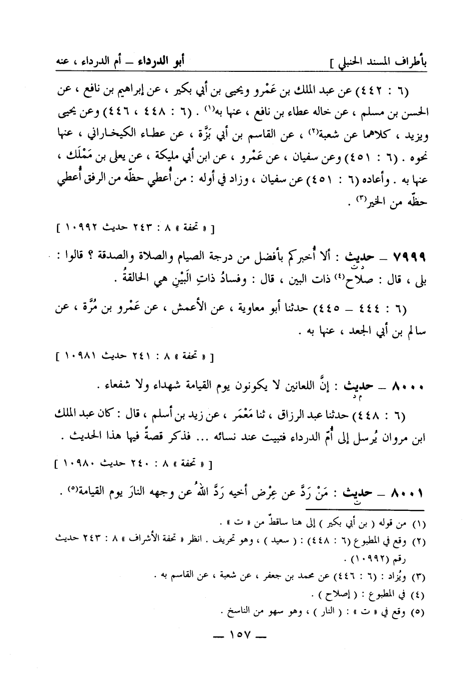 8000 -[م د] حديث: إنَّ اللعانين لا يكونون يوم القيامة شهداء ولا شفعاء. (6: 448) حَدَّثَنا عبد الرزاق، ثنا مَعْمَر، عن زيد بن أسلم، قال: كان عبد الملك بن مروان يُرسل إلى أُمّ الدرداء فتبيت عند نسائه ... فذكر قصة فيها هذا الحديث.