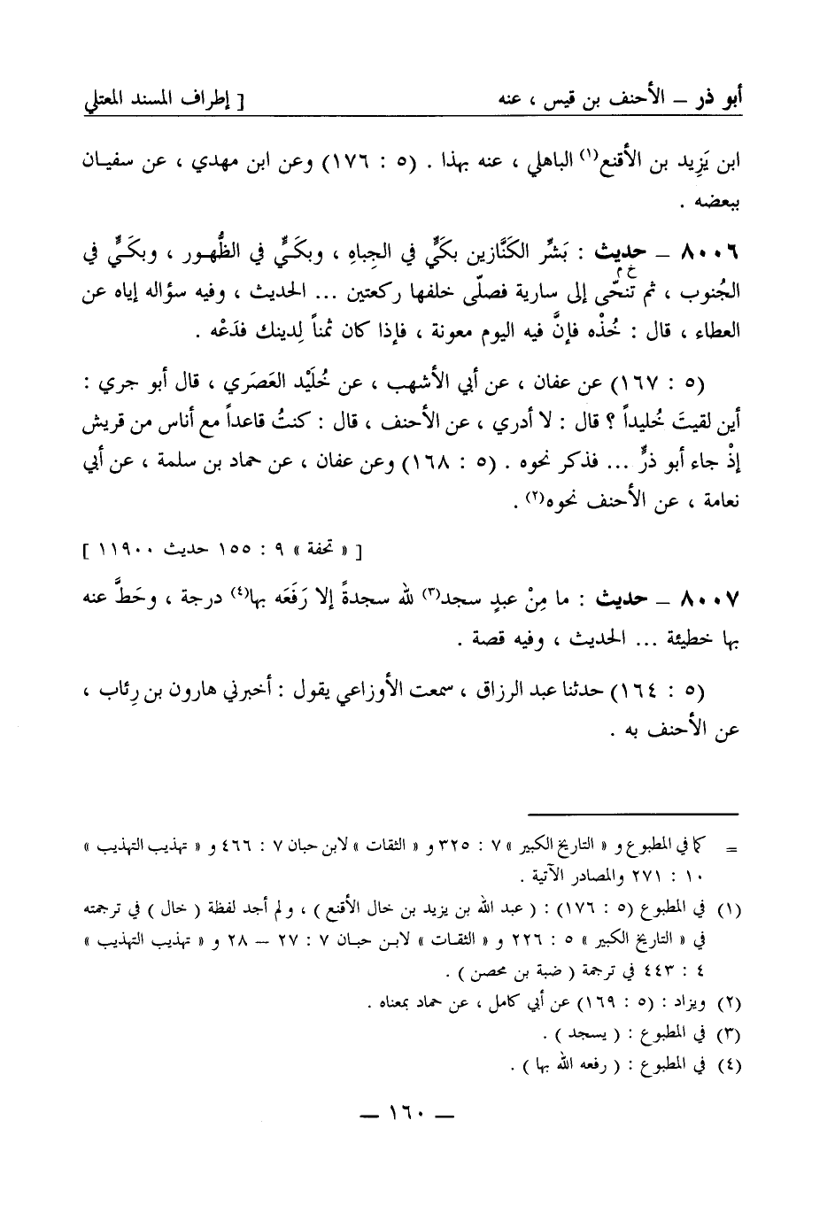 8007 - حديث: ما من عبدٍ سجد لله سجدةً إلا رَفَعَه بها درجة، وحَطَّ عنه بها خطيئة ... الحديث، وفيه قصة. (5: 164) حَدَّثَنا عبد الرزاق، سمعت الأوزاعي يقول: أخبرني هارون بن رِئاب، عن الأحنف به.