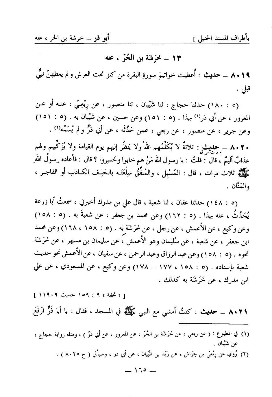 8020 -[م د ت س ق] حديث: ثلاثةٌ لا يُكَلِّمُهم اللهُ ولا يَنظرُ إليهم يوم القيامة ولا يُزَكِّيهم ولهم عذابٌ أليمٌ، قال: قلت: يا رسول الله من هم خابوا وخَسِروا؟ قال: فأعاده رسولُ اللهِ صَلَّى اللَّهُ عَلَيْهِ وَسَلَّمَ ثلاث مرات، قال: المُسْبِل، والمُنفِّقُ سِلْعَتَه بالحَلِف الكاذب أو الفاجر، والمَنَّان. (5: 148) حَدَّثَنا عفان، ثنا شُعبة، قال علي بن مدرك أخبرني، سمعتُ أبا زرعة يُحَدِّثُ، عنه بهذا. (5: 162) وعن محمد بن جعفر، عن شُعبة به. (5: 158) وعن وكيع، عن الأعمش، عن رجل، عن خَرَشَة به. (5: 158، 168) وعن محمد بن جعفر، عن شُعبة، عن سليمان وهو الأعمش، عن سليمان بن مسهر، عن خَرَشَة نحوه، (5: 158) وعن عبد الرزاق وعبد الرحمن، عن سفيان، عن الأعمش نحو حديث شُعبة بإسناده. (5: 158، 177 - 178) وعن وكيع، عن المسعودي، عن علي بن مدرك، عن خَرَشَة به كذلك.