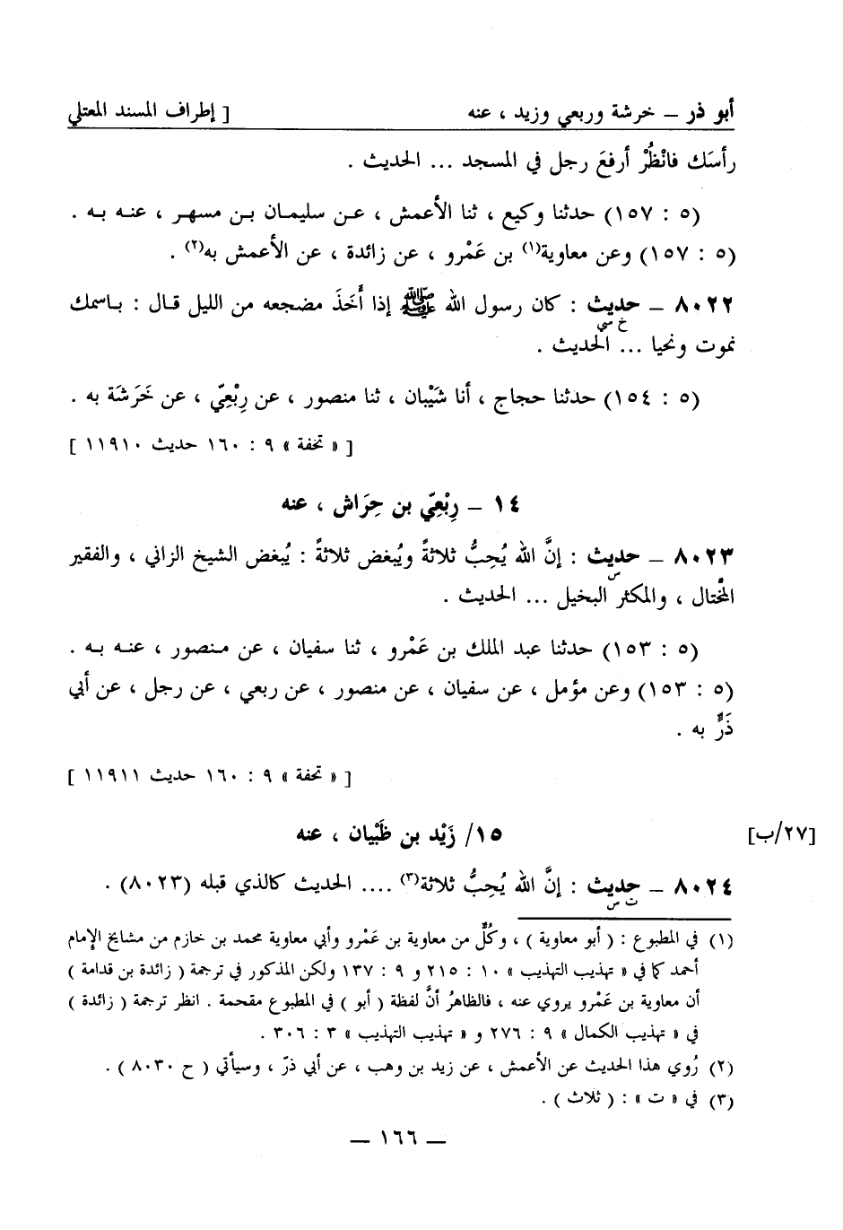 8023 -[س] حديث: إنَّ الله يُحِبُّ ثلاثةً ويُبغض ثلاثةً: يُبغض الشيخ الزاني، والفقير المختال، والمكثر البخيل ... الحديث. (5: 153) حَدَّثَنا عبد الملك بن عمرو، ثنا سفيان، عن منصور، عنه به. (5: 153) وعن مُؤمّل، عن سفيان، عن منصور، عن رِبْعِيّ، عن رجل، عن أبي ذَرٍّ به.