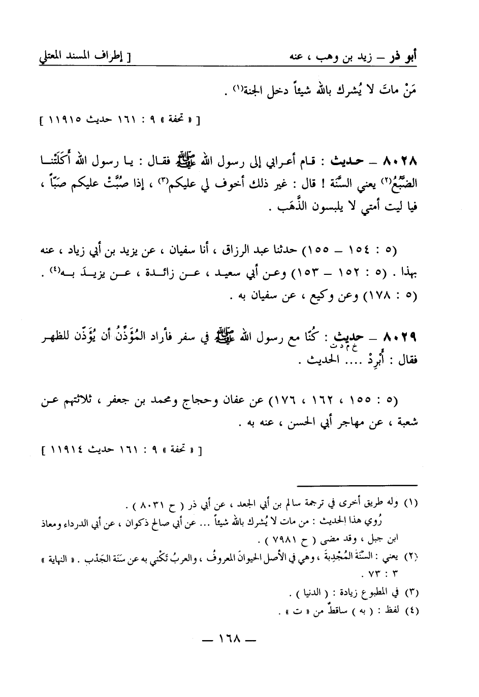 8028 - حديث: قام أعرابي إلى رسول الله صَلَّى اللَّهُ عَلَيْهِ وَسَلَّمَ فقال: يا رسول الله أَكَلَتْنا الضَّبُعُ يعني السَّنَة! قال: غير ذلك أخوف لي عليكم، إذا صُبَّتْ عليكم صَبّاً، فيا ليت أُمّتي لا يلبسون الذَّهَب. (5: 154 - 155) حَدَّثَنا عبد الرزاق، أنا سفيان، عن يزيد بن أبي زياد، عنه بهذا. (5: 152 - 153) وعن أبي سعيد، عن زائدة، عن يزيد به. (5: 178) وعن وكيع، عن سفيان به.
