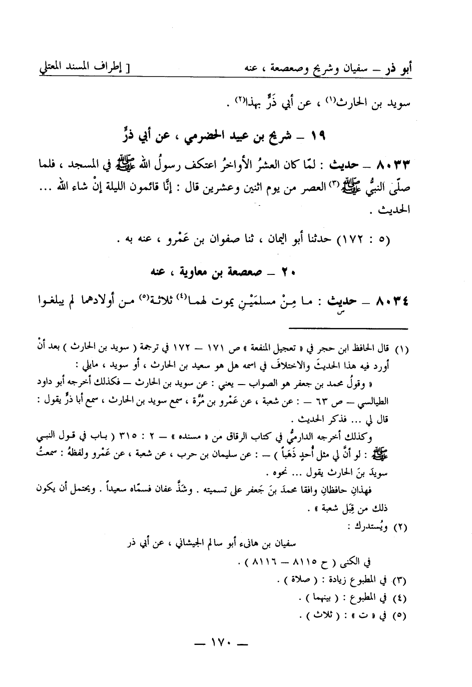 8034 -[س] حديث: ما من مسلمَيْنِ يموت لهما ثلاثة من أولادهما لم يبلغوا -[171]- الحِنْثَ إلا غَفَرَ الله لهما ... الحديث، وفيه: ما من مسلم ينفق من كُلِّ ماله زوجين ... . الحديث. (5: 151) حَدَّثَنا إسماعيل، ثنا يونس، عن الحَسَن، عنه به. (5: 159، 153) وعن يحيى وعبد الملك بن عمرو، كلاهما عن قرة. (5: 164) وعن يزيد، عن هشام، كلاهما عن الحَسَن به.