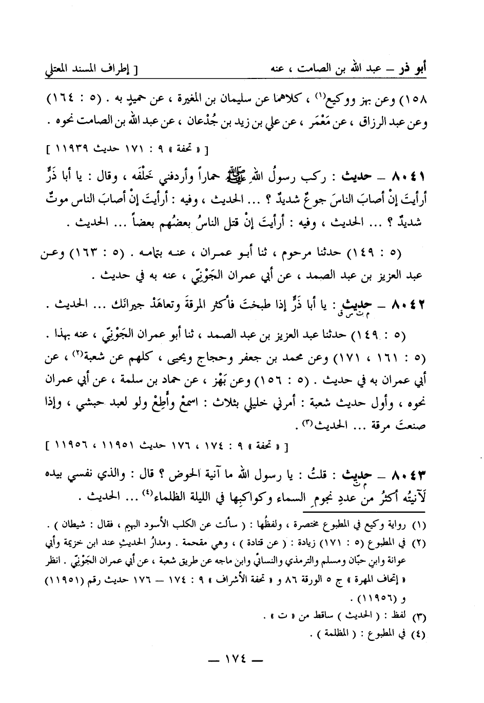 8041 - حديث: ركب رسولُ الله صَلَّى اللَّهُ عَلَيْهِ وَسَلَّمَ حماراً وأردفني خَلْفَه، وقال: يا أبا ذَرٍّ أرأيتَ إن أصابَ الناسَ جوعٌ شديدٌ؟ ... الحديث، وفيه: أرأيتَ إن أصابَ الناسَ موتٌ شديدٌ؟ ... . الحديث، وفيه: أرأيتَ إن قتل الناسُ بعضهم بعضاً ... . الحديث. (5: 149) حَدَّثَنا مرحوم، ثنا أبو عمران، عنه بتمامه. (5: 163) وعن عبد العزيز بن عبد الصمد، عن أبي عمران الجَوْنِيّ، عنه به في حديث.