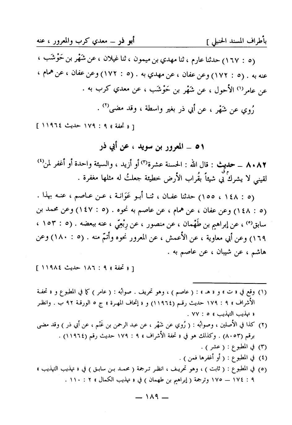 8082 -[م ق] حديث: قال الله: الحسنة عشرة أو أزيد، والسيئة واحدة أو أغفر لمن لقيني لا يشرك بي شيئاً بقُراب الأرض خطيئة جعلتُ له مثلها مغفرة. (5: 148، 155) حَدَّثَنا عفان، ثنا أبو عَوَانة، عن عاصم، عنه بهذا. (5: 148) وعن عفان، عن هَمَّام، عن عاصم به نحوه. (5: 147) وعن محمد بن سابق، عن إبراهيم بن طهمان، عن منصور، عن رِبْعِيّ، عنه ببعضه. (5: 153، 169) وعن أبي معاوية، عن الأعمش، عن المعرور نحوه وأتمّ منه. (5: 180) وعن هاشم، عن شَيْبان، عن عاصم به.