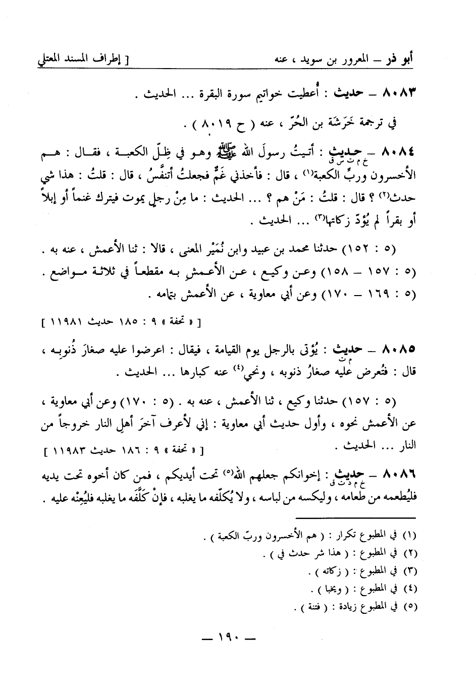 8084 -[خ م ت س ق] حديث: أتيتُ رسولَ الله صَلَّى اللَّهُ عَلَيْهِ وَسَلَّمَ وهو في ظِلّ الكعبة، فقال: هم الأخسرون ورَبِّ الكعبة، قال: فأخذني غَمٌّ فجعلت أتنفَّسُ، قال: قلت: هذا شي حدث؟ قال: قلت: من هم؟ ... الحديث: ما من رجلٍ يموت فيترك غنماً أو إبلاً أو بقراً لم يُؤدّ زكاتها ... الحديث. (5: 152) حَدَّثَنا محمد بن عُبَيد وابن نُمَير المعنى، قالا: ثنا الأعمش، عنه به. (5: 157 - 158) وعن وكيع، عن الأعمش به مقطعاً في ثلاثة مواضع. (5: 169 - 170) وعن أبي معاوية، عن الأعمش بتمامه.