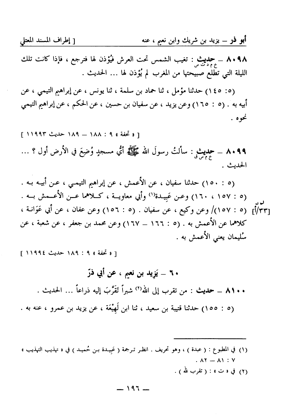 8099 -[خ م س ق] حديث: سألتُ رسول الله صَلَّى اللَّهُ عَلَيْهِ وَسَلَّمَ أيُّ مسجدٍ وُضِعَ في الأرض أول؟ ... . الحديث. (5: 150) حَدَّثَنا سفيان، عن الأعمش، عن إبراهيم التيمي، عن أبيه به. (5: 157، 160) وعن عَبِيدة وأبي معاوية، كلاهما عن الأعمش به. (5: 157) وعن وكيع، عن سفيان. (5: 156) وعن عفان، عن أبي عَوَانة، كلاهما عن الأعمش به. (5: 166 - 167) وعن محمد بن جعفر، عن شُعبة، عن سليمان يعني الأعمش به.