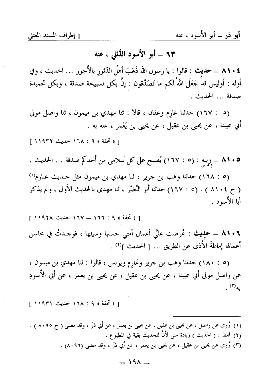 8104 -[م] حديث: قالوا: يا رسول الله ذَهَبَ أهلُ الدّثورِ بالأجور ... الحديث، وفي أوله: أوليس قد جَعَلَ اللهُ لكم ما تَصَدَّقون: إنَّ بكُلّ تسبيحة صدقة، وبكُلّ تحميدة صدقة ... . الحديث. (5: 167) حدثنا عَارِم وعفان، قالا: ثنا مهدي بن ميمون، ثنا واصل مولى أبي عُيَينة، عن يحيى بن عقيل، عن يحيى بن يَعْمَر، عنه به.