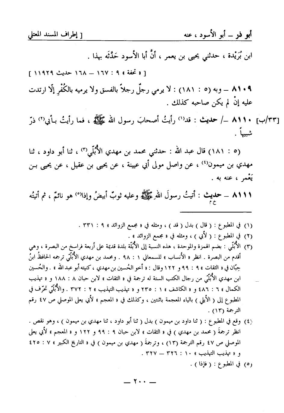 8110 - حديث: قد رأيتُ أصحابَ رسول الله صَلَّى اللَّهُ عَلَيْهِ وَسَلَّمَ، فما رأيتُ بأبي ذَرّ شبيهاً. (5: 181) قال عبد الله: حَدَّثَني محمد بن مهدي الأُبُلّي، ثنا أبو داود، ثنا مهدي بن ميمون، عن واصل مولى أبي عُيَينة، عن يحيى بن عقيل، عن يحيى بن يَعْمَر، عنه به.
