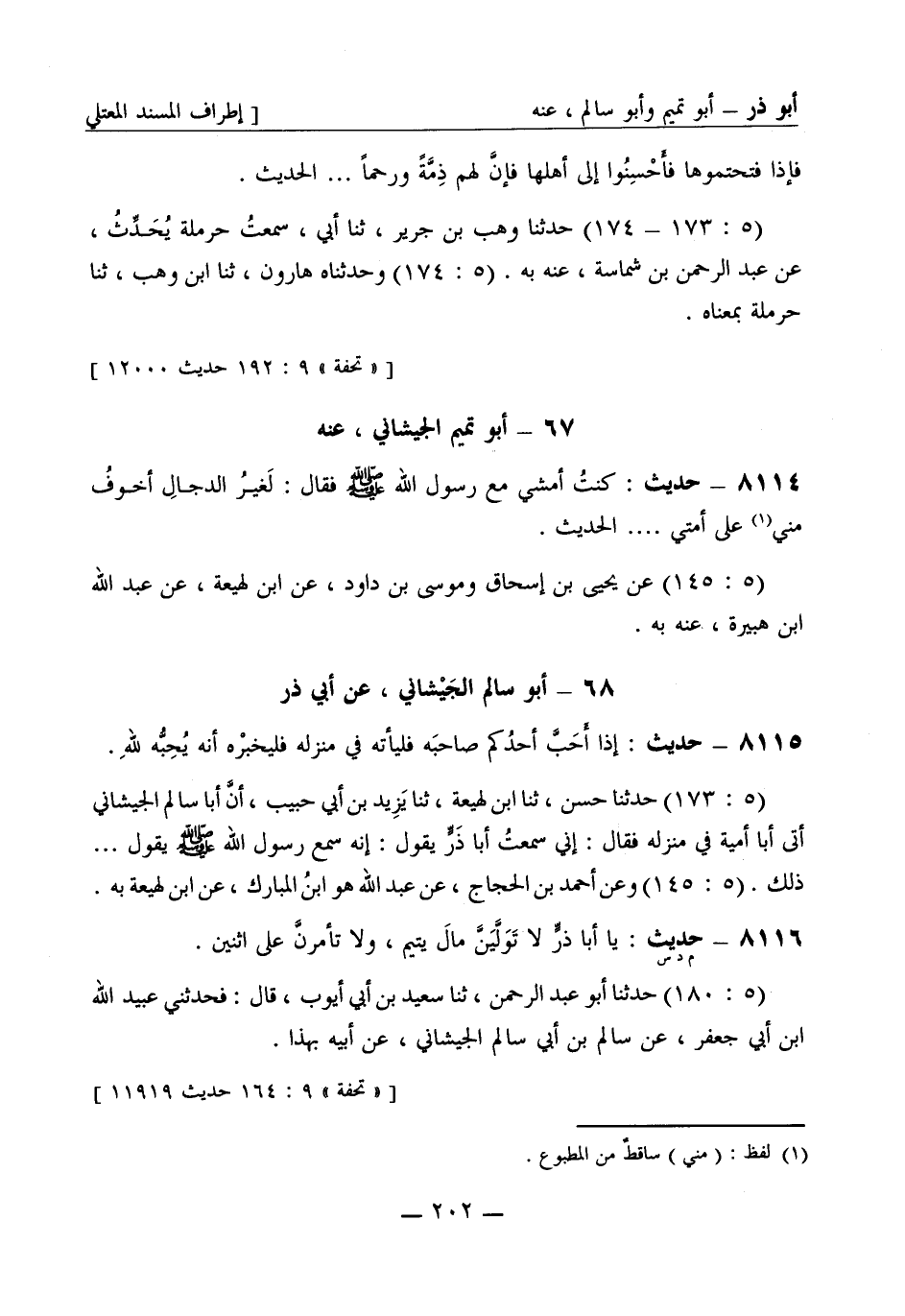8115 - حديث: إذا أَحَبَّ أَحَدُكم صاحبَه فليأته في منزله فليخبره أنه يُحِبُّه لله. (5: 173) حَدَّثَنا حَسَن، ثنا ابن لَهِيْعَة، ثنا يزيد بن أبي حبيب، أنَّ أبا سالم الجَيْشاني أتى أبا أُمّية في منزله فقال: إني سمعتُ أبا ذَرٍّ يقول: إنه سمع رسول الله صَلَّى اللَّهُ عَلَيْهِ وَسَلَّمَ يقول ... . ذلك. (5: 145) وعن أحمد بن الحجاج، عن عبد الله هو ابن المبارك، عن ابن لَهِيْعَة به.