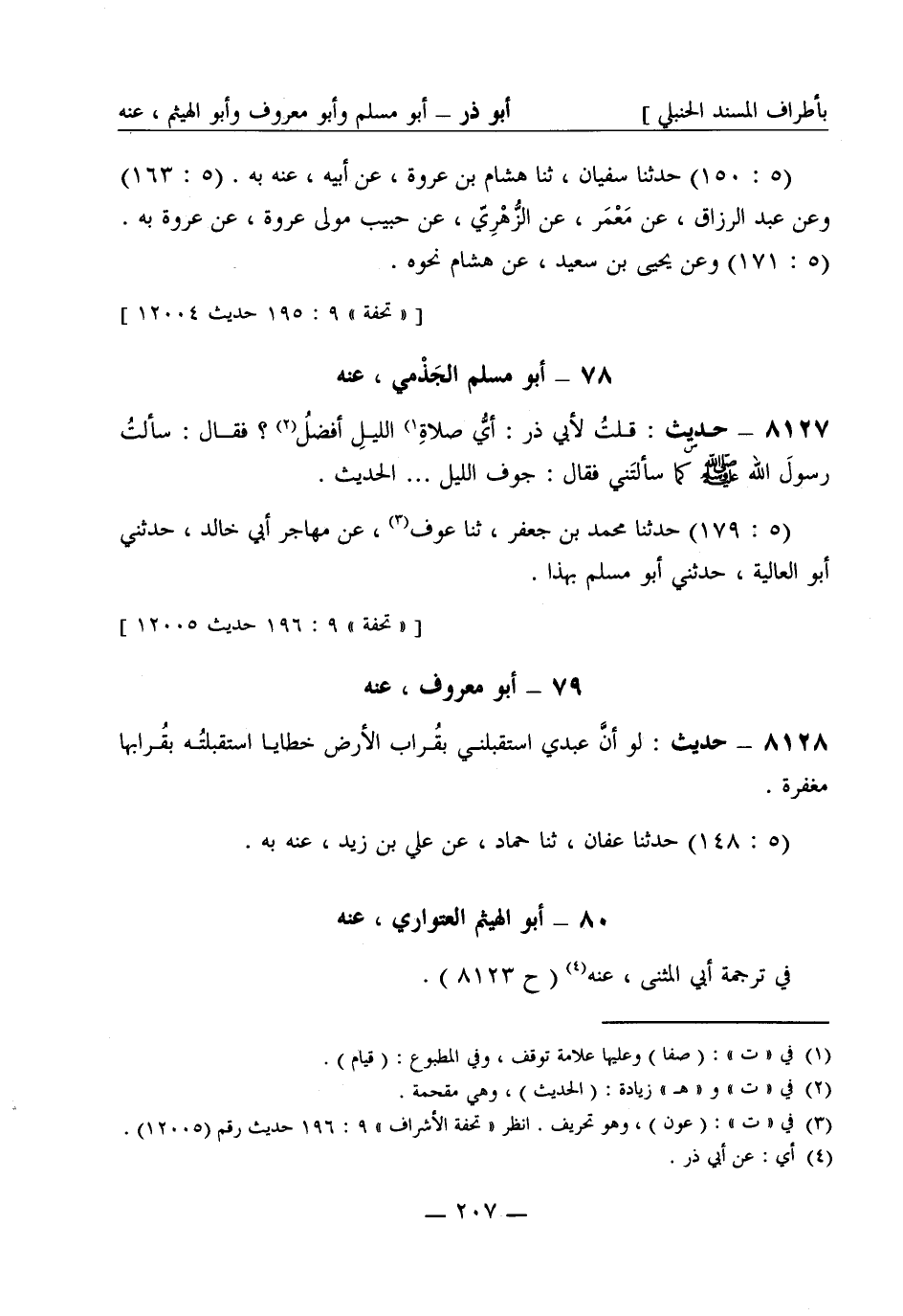 8127 -[س] حديث: قلت لأبي ذَرّ: أيُّ صلاةِ الليل أفضلُ؟ فقال: سألتُ رسول الله صَلَّى اللَّهُ عَلَيْهِ وَسَلَّمَ كما سألتَني فقال: جوف الليل ... . الحديث. (5: 179) حَدَّثَنا محمد بن جعفر، ثنا عَوْف، عن مهاجر أبي خالد، حَدَّثَني أبو العالية، حَدَّثَني أبو مسلم بهذا.