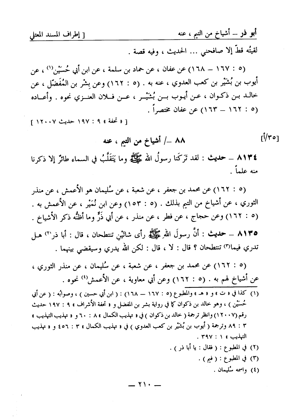 8134 - حديث: لقد تَرَكَنا رسولُ الله صَلَّى اللَّهُ عَلَيْهِ وَسَلَّمَ وما يَتَقَلَّبُ في السَّماء طائرٌ إلا ذكرنا منه علماً. (5: 162) عن محمد بن جعفر، عن شُعبة، عن سليمان هو الأعمش، عن منذر الثَّوْرِيّ، عن أشياخ من التيم بذلك. (5: 153) وعن ابن نُمَير، عن الأعمش به. (5: 162) وعن حجاج، عن فِطْر، عن منذر، عن أبي ذَرٍّ وما أظنُّه ذكر الأشياخ.