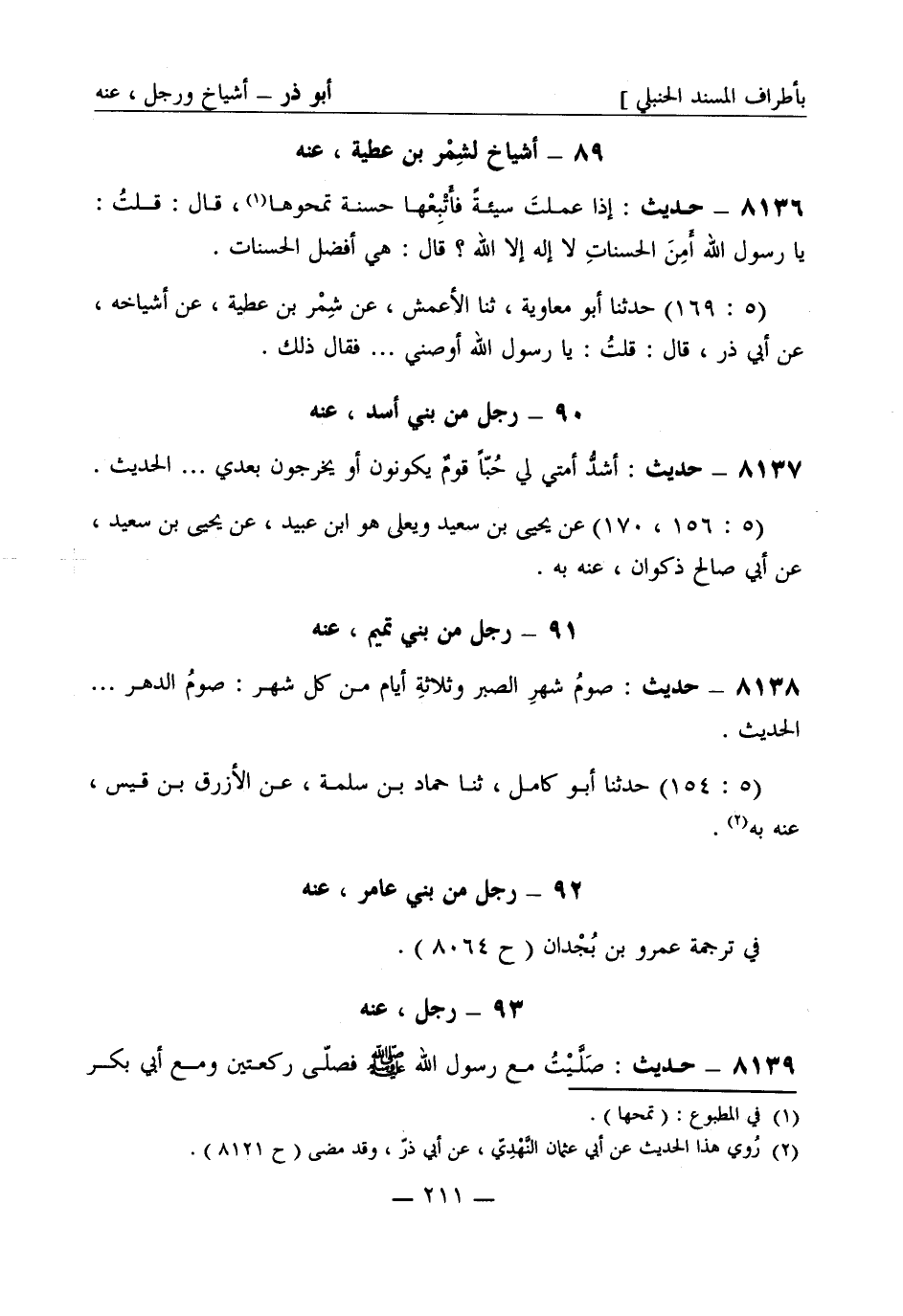8136 - حديث: إذا عملتَ سيئةً فأَتْبِعْها حسنة تمحوها، قال: قلت: يا رسول الله أَمِنَ الحسناتِ لا إله إلا الله؟ قال: هي أفضل الحسنات. (5: 169) حَدَّثَنا أبو معاوية، ثنا الأعمش، عن شِمْر بن عطية، عن أشياخه، عن أبي ذَرّ، قال: قلت: يا رسول الله أوصني ... فقال ذلك.