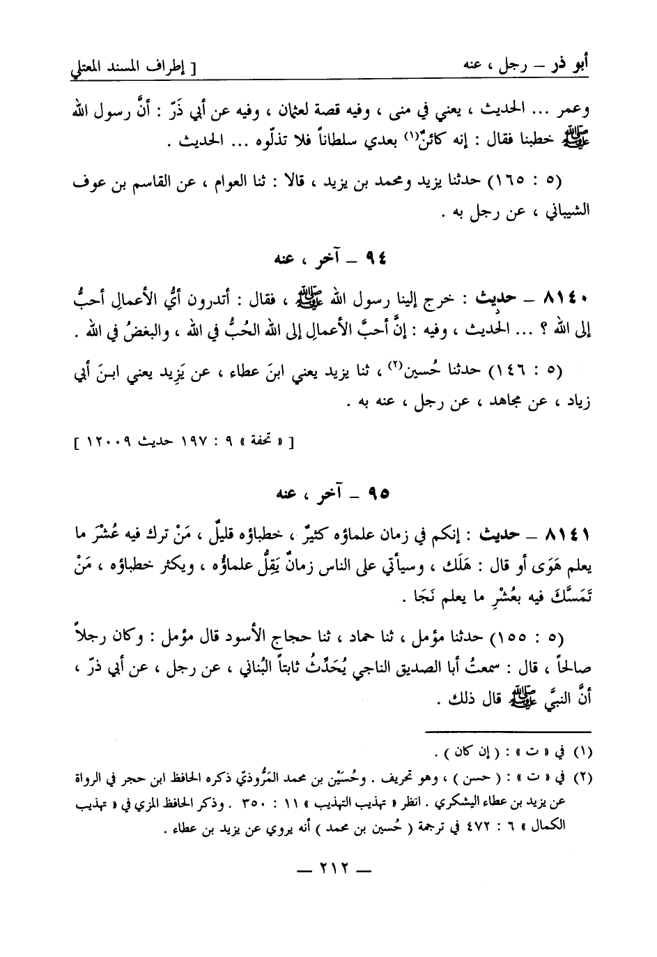 8141 - حديث: إنكم في زمان علماؤه كثيرٌ، خطباؤه قليلٌ، من ترك فيه عُشْرَ ما يعلم هَوَى أو قال: هَلَك، وسيأتي على الناس زمانٌ يَقِلُّ علماؤُه، ويكثر خطباؤه، من تَمَسَّكَ فيه بعُشْرِ ما يعلم نَجَا. (5: 155) حَدَّثَنا مُؤمّل، ثنا حمّاد، ثنا حجاج الأسود قال مُؤمّل: وكان رجلاً صالحاً، قال: سمعتُ أبا الصديق الناجي يُحَدِّثُ ثابتاً البُنَانِيّ، عن رجل، عن أبي ذَرّ، أنَّ النبيَّ صَلَّى اللَّهُ عَلَيْهِ وَسَلَّمَ قال ذلك.