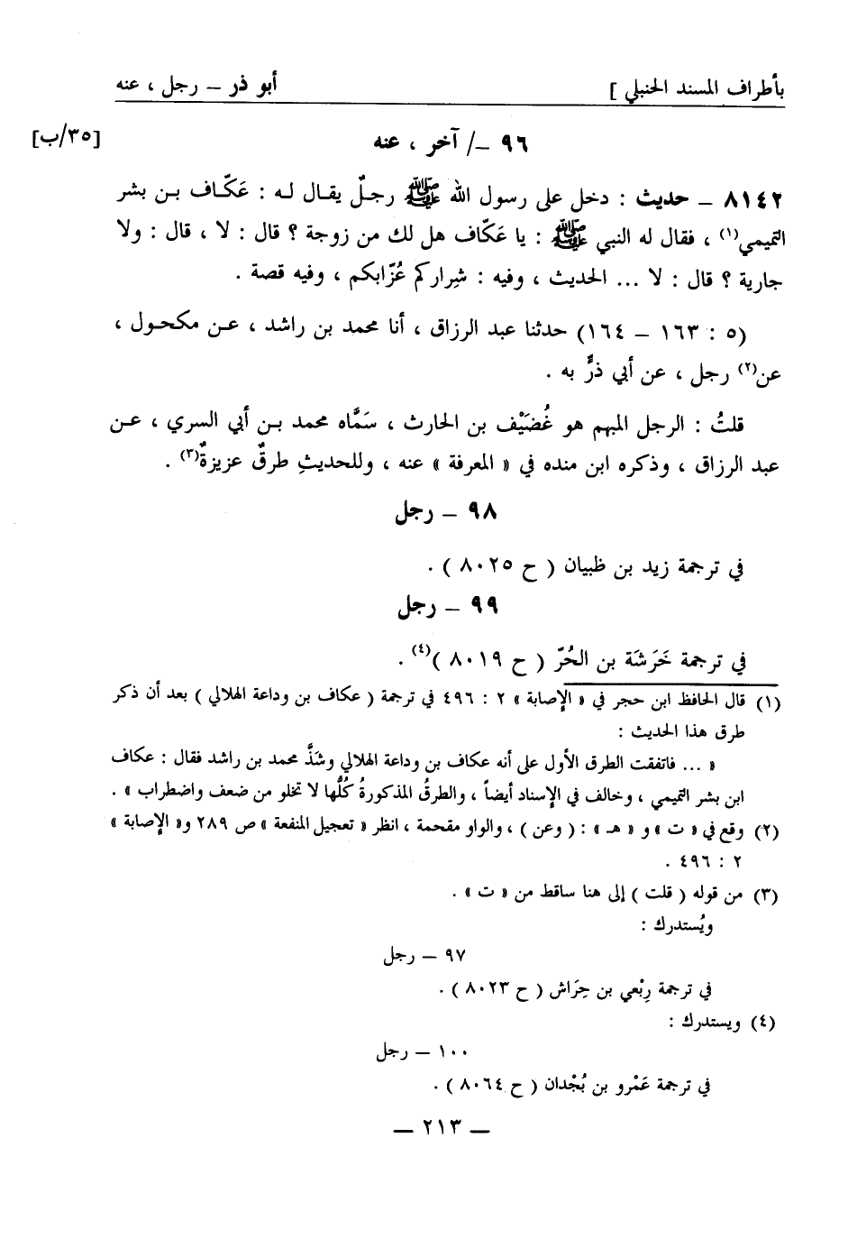8142 - حديث: دخل على رسول الله صَلَّى اللَّهُ عَلَيْهِ وَسَلَّمَ رجلٌ يُقال له: عَكّاف بن بِشْر التميمي، فقال له النبيّ صَلَّى اللَّهُ عَلَيْهِ وَسَلَّمَ: يا عَكّاف هل لك من زوجة؟ قال: لا، قال: ولا جارية؟ قال: لا ... . الحديث، وفيه: شِراركم عُزّابكم، وفيه قصة. (5: 163 - 164) حَدَّثَنا عبد الرزاق، أنا محمد بن راشد، عن مكحول، عن رجل، عن أبي ذَرٍّ به. قلت: الرجل المبهم هو غُضَيْف بن الحارث، سَمَّاه محمد بن أبي السري، عن عبد الرزاق، وذكره ابن منده في المعرفة عنه، وللحديث طرقٌ عزيزةٌ.