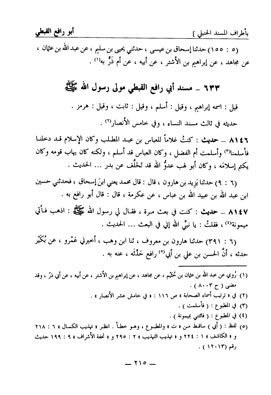 مسند أبي رافع القبطي مولى رسول الله صَلَّى اللَّهُ عَلَيْهِ وَسَلَّمَ قيل: اسمه إبراهيم، وقيل: أسلم، وقيل: ثابت، وقيل: هرمز. حديثه في ثالث مسند النِّساء، وفي خامس الأنصار.