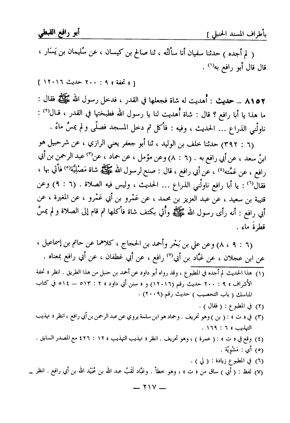 8152 - حديث: أُهديت له شاة فجعلها في القدر، فدخل رسول الله صَلَّى اللَّهُ عَلَيْهِ وَسَلَّمَ فقال: ما هذا يا أبا رافع؟ قال: شاة أُهديت لنا يا رسول الله فطبختها في القدر، قال: ناولْني الذراع ... . الحديث، وفيه: فأكل ثم دخل المسجد فصَلّى ولم يَمسَّ ماءً. (6: 392) حَدَّثَنا خلف بن الوليد، ثنا أبو جعفر يعني الرازي، عن شُرَحبيل هو ابن سعد، عن أبي رافع به. (6: 8) وعن مُؤمّل، عن حمّاد، عن عبد الرحمن بن أبي رافع، عن عَمَّته، عن أبي رافع، قال: صنع لرسول الله صَلَّى اللَّهُ عَلَيْهِ وَسَلَّمَ شاة مَصْلِيَّة فأتي بها، فقال: يا أبا رافع ناولْني الذراع ... . الحديث، وليس فيه الصلاة. (6: 9) وعن قُتَيبة بن سعيد، عن عبد العزيز بن محمد، عن عمرو بن أبي عمرو، عن المغيرة، عن أبي رافع: أنه رأى رسول الله صَلَّى اللَّهُ عَلَيْهِ وَسَلَّمَ وأُتي بكتف شاة فأكلها ثم قام إلى الصلاة ولم يَمسَّ قطرةَ ماء. (6: 9، 8) وعن علي بن بَحْر وأحمد بن الحجاج، كلاهما عن حاتم بن إسماعيل، عن ابن عَجْلان، عن عَبَّاد بن أبي رافع، عن أبي غطفان، عن أبي رافع بمعناه.