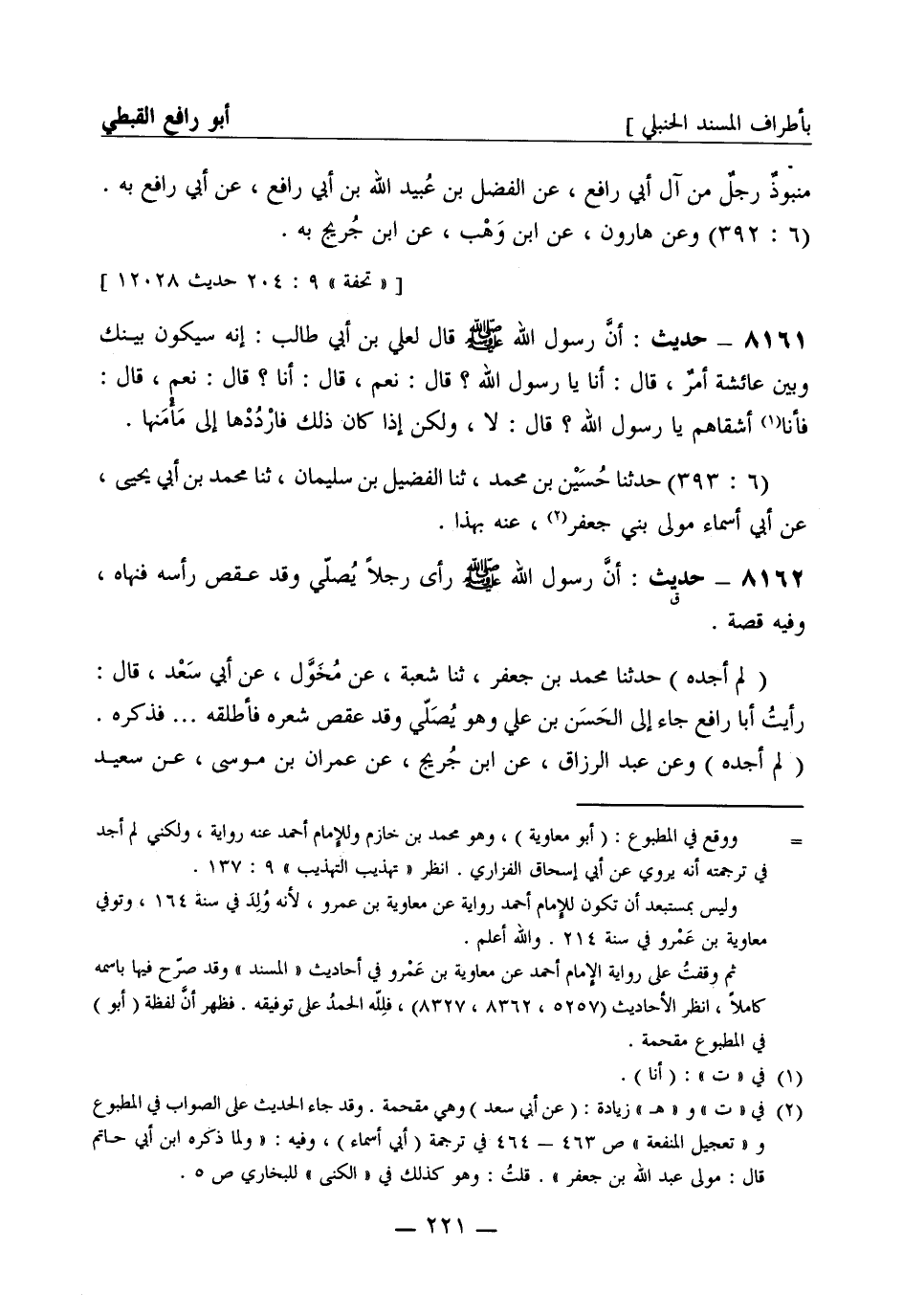 8162 -[ق] حديث: أنَّ رسول الله صَلَّى اللَّهُ عَلَيْهِ وَسَلَّمَ رأى رجلاً يُصَلّي وقد عقص رأسه فنهاه، وفيه قصة. (لم أجده) حَدَّثَنا محمد بن جعفر، ثنا شُعبة، عن مُخَوَّل، عن أبي سعد، قال: رأيتُ أبا رافع جاء إلى الحَسَن بن علي وهو يُصَلّي وقد عقص شعره فأطلقه ... فذكره. (لم أجده) وعن عبد الرزاق، عن ابن جُرَيج، عن عمران بن موسى، عن سعيد -[222]- المَقْبُرِيّ، عن أبيه: أنه رأى أبا رافع ... نحوه. (لم أجده) وعن أبي كامل، عن زُهَير، عن أبي سعيد المؤدب/ بمعناه. (6: 391، 8) وعن وكيع وعبد الرزاق، عن سفيان، عن مُخَوَّل، عن رجلٍ، عن أبي رافع به.