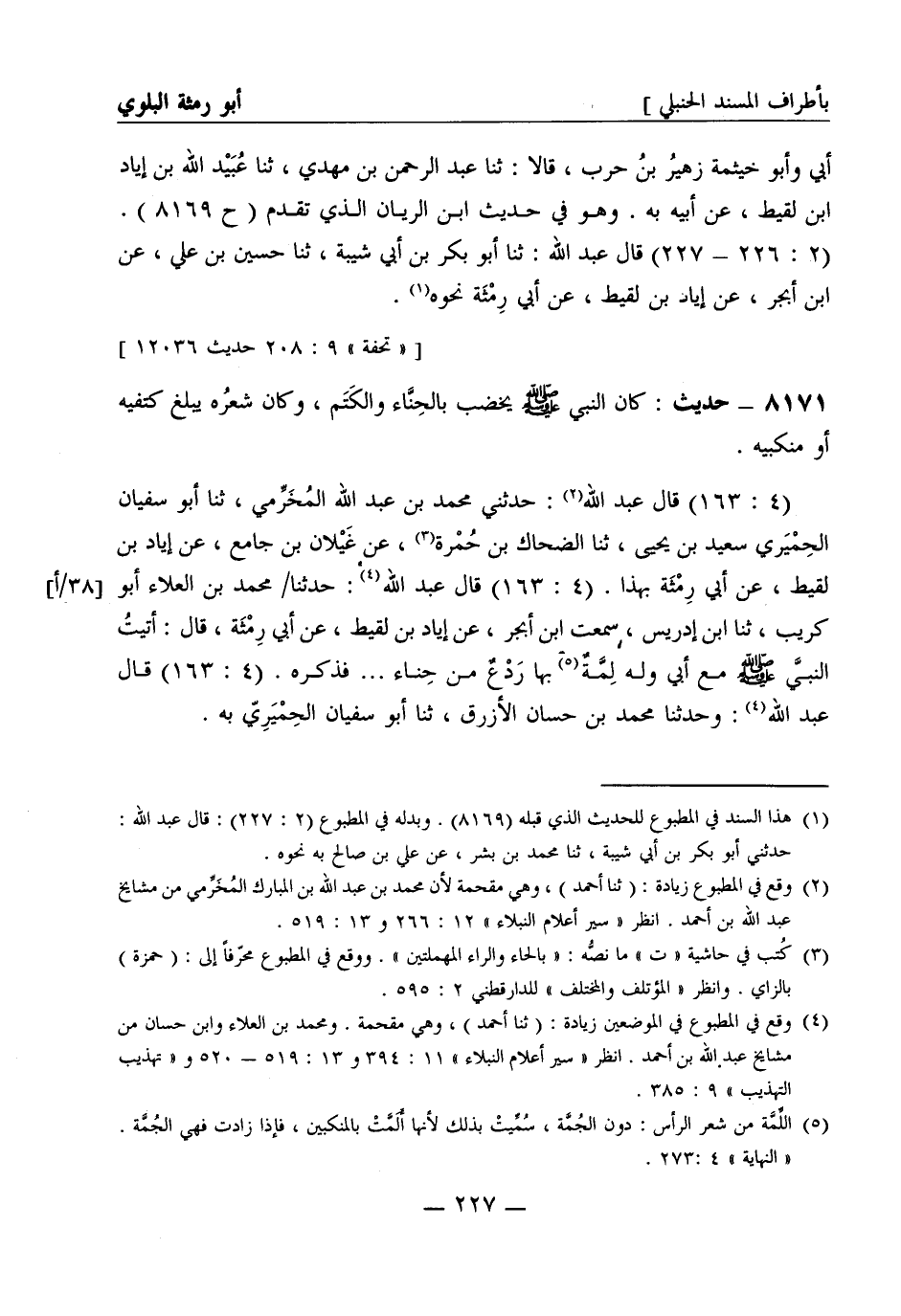 8171 - حديث: كان النبيّ صَلَّى اللَّهُ عَلَيْهِ وَسَلَّمَ يخضب بالحِنَّاء والكَتَم، وكان شعرُه يبلغ كتفيه أو منكبيه. (4: 163) قال عبد الله: حَدَّثَني محمد بن عبد الله المُخَرِّمي، ثنا أبو سفيان الحِمْيَرِيّ سعيد بن يحيى، ثنا الضحاك بن حُمْرة، عن غَيْلان بن جامع، عن إياد بن لقيط، عن أبي رِمْثَة بهذا. (4: 163) قال عبد الله: حَدَّثَنا محمد بن العلاء أبو كريب، ثنا ابن إدريس، سمعت ابن أَبْجَر، عن إياد بن لقيط، عن أبي رِمْثَة، قال: أتيتُ النبيّ صَلَّى اللَّهُ عَلَيْهِ وَسَلَّمَ مع أبي وله لِمَّةٌ بها رَدْعٌ من حِنَّاء ... فذكره. (4: 163) قال عبد الله: وحَدَّثَنا محمد بن حَسَّان الأزرق، ثنا أبو سفيان الحِمْيَرِيّ به.