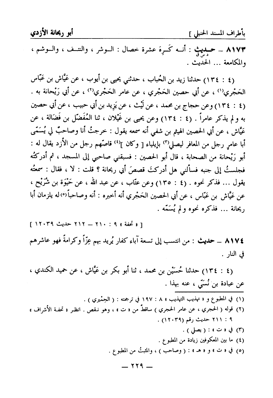 8173 -[د س ق] حديث: أنه كَرِهَ عشرة خصال: الوشر، والنتف، والوشم، والمكامعة ... . الحديث. (4: 134) حَدَّثَنا زيد بن الحُبَاب، حَدَّثَني يحيى بن أيوب، عن عَيَّاش بن عباس الحَجْري، عن أبي حصين الحَجْري، عن عامر الحَجْري، عن أبي رَيْحانة به. (4: 134) وعن حجاج بن محمد، عن لَيْث، عن يزيد بن أبي حبيب، عن أبي حصين به ولم يذكر عامراً. (4: 134) وعن يحيى بن غَيْلان، ثنا المُفَضّل بن فَضَالة، عن عَيَّاش، عن أبي الحصين الهَيْثم بن شفي أنه سمعه يقول: خرجتُ أنا وصاحبٌ لي يُسَمّى أبا عامرٍ رجل من المعافر ليصلّي بإيلياء [وكان] قاصّهم رجل من الأزد يُقال له: أبو رَيْحانة من الصحابة، قال أبو حصين: فسبقني صاحبي إلى المسجد، ثم أدركتُه فجلست إلى جنبه فسألني هل أدركتَ قصصَ أبي رَيْحانة؟ قلت: لا، فقال: سمعتُه يقول ... فذكر نحوه. (4: 135) وعن عَتَّاب، عن عبد الله، عن حيوه بن شُرَيْح، عن عَيَّاش بن عباس، عن أبي الحصين الحَجْري أنه أخبره: أنه وصاحباً له يلزمان أبا رَيْحانة ... . فذكره نحوه ولم يُسَمّه.