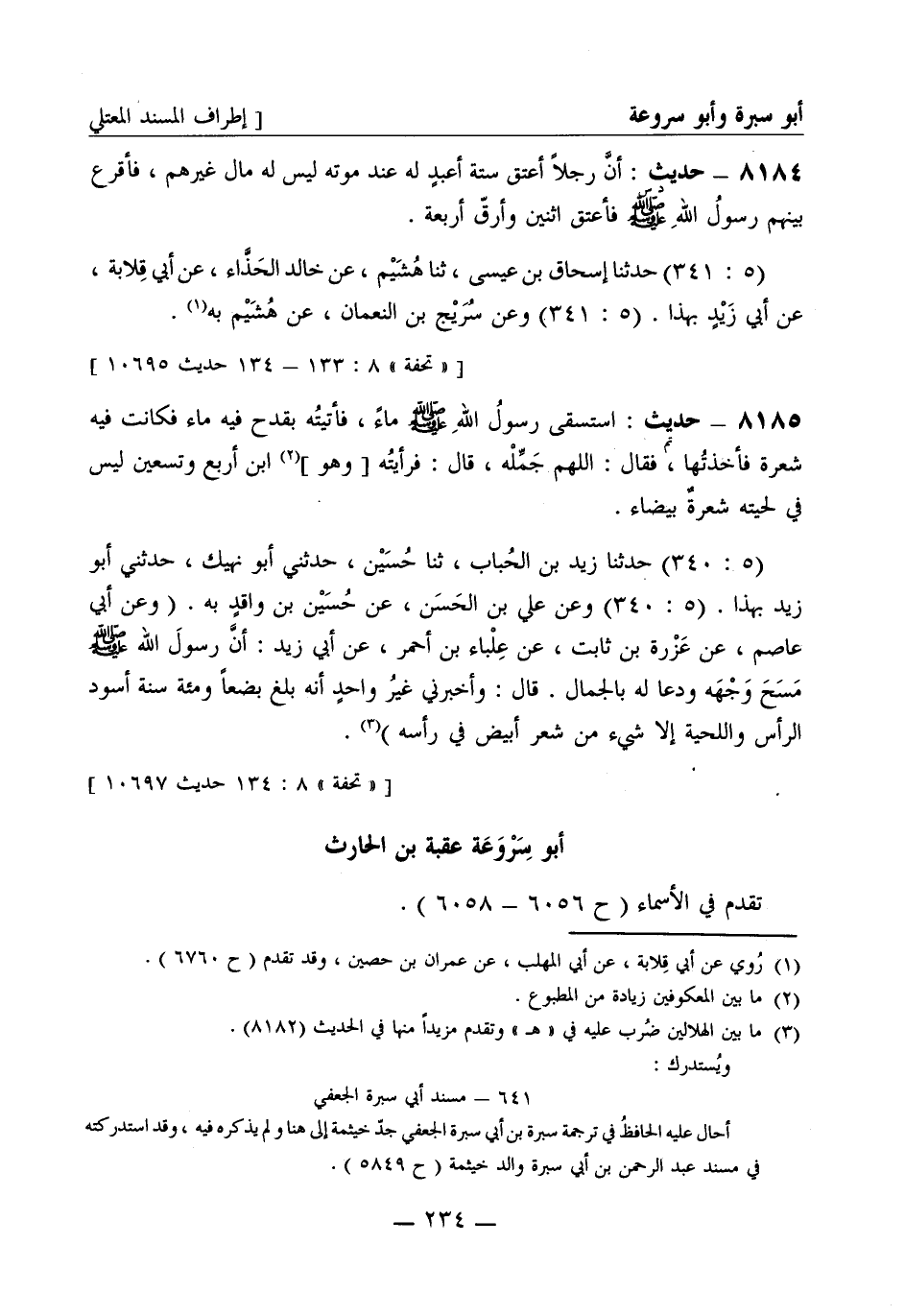[تحفة 8: 134 حديث 10697] أبو سِرْوَعَة عقبة بن الحارث تقدم في الأسماء (ح 6056 - 6058) .
