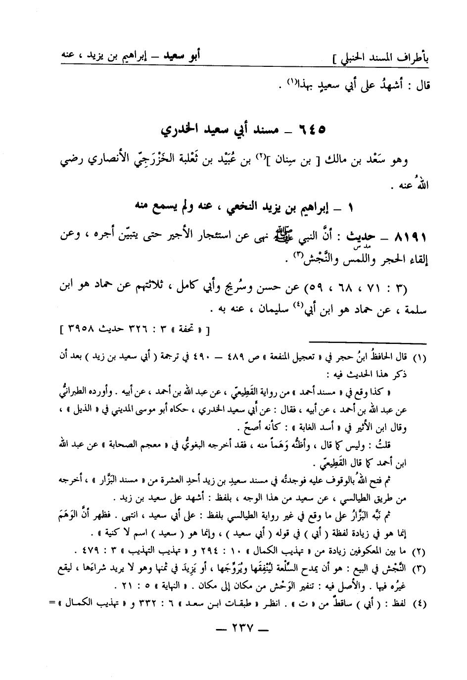 8191 - (مد س) حديث: أنَّ النبيَّ صَلَّى اللَّهُ عَلَيْهِ وَسَلَّمَ نَهَى عن استئجار الأجير حتى يتبيّن أجره، وعن إلقاء الحجر واللمس والنَّجْش. (3: 71، 68، 59) عن حَسَن وسُرَيج وأبي كامل، ثلاثتهم عن حمّاد هو ابن سَلَمة، عن حمّاد هو ابن أبي سليمان، عنه به.