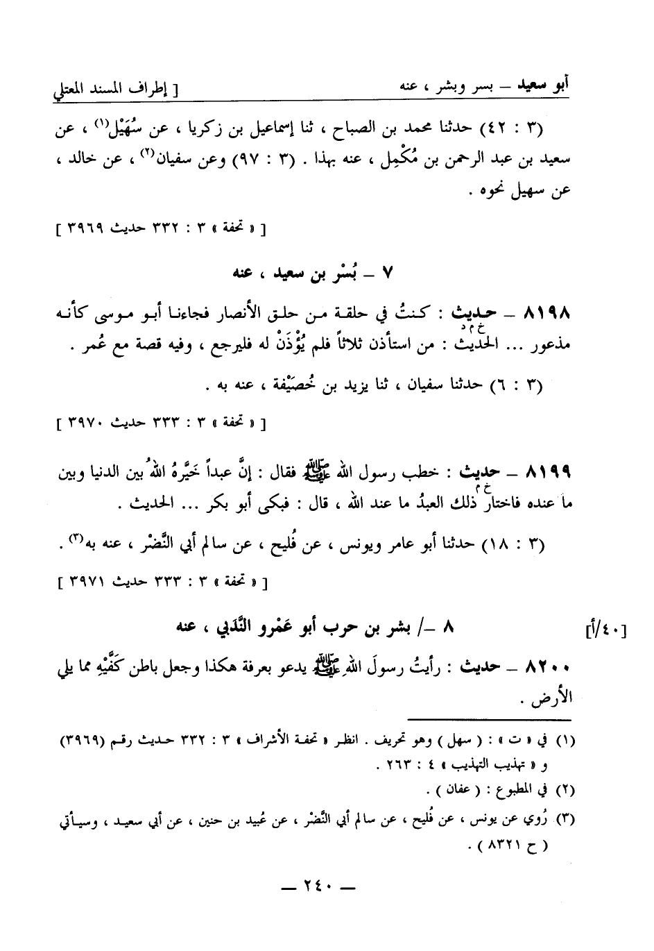 8199 -[خ م] حديث: خطب رسول الله صَلَّى اللَّهُ عَلَيْهِ وَسَلَّمَ فقال: إنَّ عبداً خَيَّرهُ اللهُ بين الدُّنيا وبين ما عنده فاختار ذلك العبدُ ما عند الله، قال: فبكى أبو بكر ... الحديث. (3: 18) حَدَّثَنا أبو عامر ويونس، عن فُلَيح، عن سالم أبي النَّضْر، عنه به.