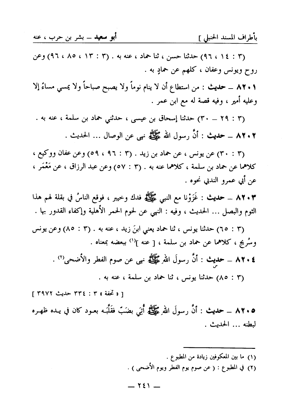 8202 - حديث: أنَّ رسول الله صَلَّى اللَّهُ عَلَيْهِ وَسَلَّمَ نَهَى عن الوصال..... الحديث. (3: 30) عن يونس، عن حمّاد بن زيد. (3: 96، 59) وعن عفان ووكيع، كلاهما عن حمّاد بن سَلَمة، كلاهما عنه به. (3: 57) وعن عبد الرزاق، عن مَعْمَر، عن أبي عمرو النَّدَبي نحوه.
