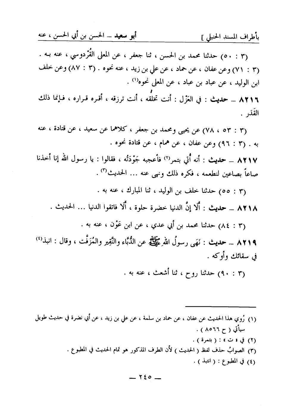 8216 - حديث: في العَزْل: أنت تخلقه، أنت ترزقه، أقره قراره، فإنما ذلك القَدَر. (3: 53، 78) عن يحيى ومحمد بن جعفر، كلاهما عن سعيد، عن قَتَادة، عنه به. (3: 96) وعن عفان، عن هَمَّام، عن قَتَادة نحوه.
