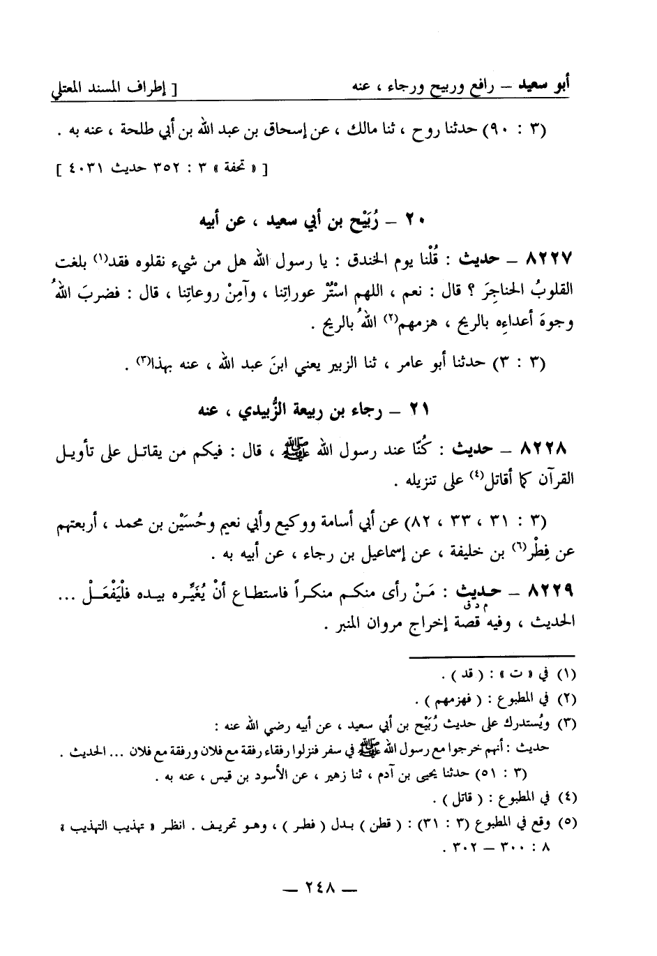 8228 - حديث: كُنّا عند رسول الله صَلَّى اللَّهُ عَلَيْهِ وَسَلَّمَ، قال: فيكم من يقاتل على تأويل القرآن كما أقاتل على تنزيله. (3: 31، 33، 82) عن أبي أسامة ووكيع وأبي نعيم وحُسَين بن محمد، أربعتهم عن فِطْر بن خليفة، عن إسماعيل بن رجاء، عن أبيه به.
