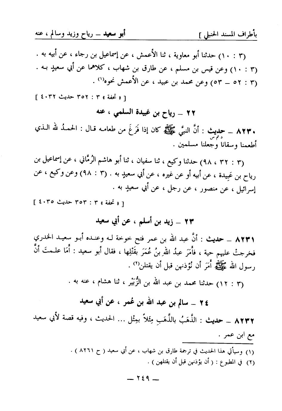 8231 - حديث: أنَّ عبد الله بن عمر فتح خوخة له وعنده أبو سعيد الخُدْرِيّ فخرجت عليهم حيّة، فأَمَرَ عبد الله بن عمر بقَتْلِها، فقال أبو سعيد: أَمَا علمتَ أنَّ رسول الله صَلَّى اللَّهُ عَلَيْهِ وَسَلَّمَ أَمَرَ أن نُؤذنهن قبل أن يقتلن. (3: 12) حَدَّثَنا محمد بن عبد الله بن الزُّبَير، ثنا هشام، عنه به.