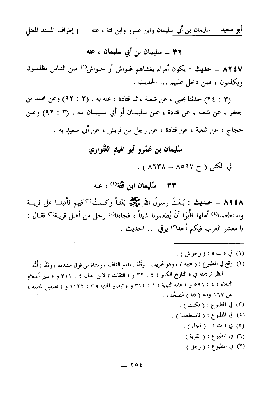 8247 - حديث: يكون أمراء يغشاهم غواش أو حواش من الناس يظلمون ويكذبون، فمن دخل عليهم ... . الحديث. (3: 24) حَدَّثَنا يحيى، عن شُعبة، ثنا قَتَادة، عنه به. (3: 92) وعن محمد بن جعفر، عن شُعبة، عن قَتَادة، عن سليمان أو أبي سليمان به. (3: 92) وعن حجاج، عن شُعبة، عن قَتَادة، عن رجل من قُرَيش، عن أبي سعيدٍ به.