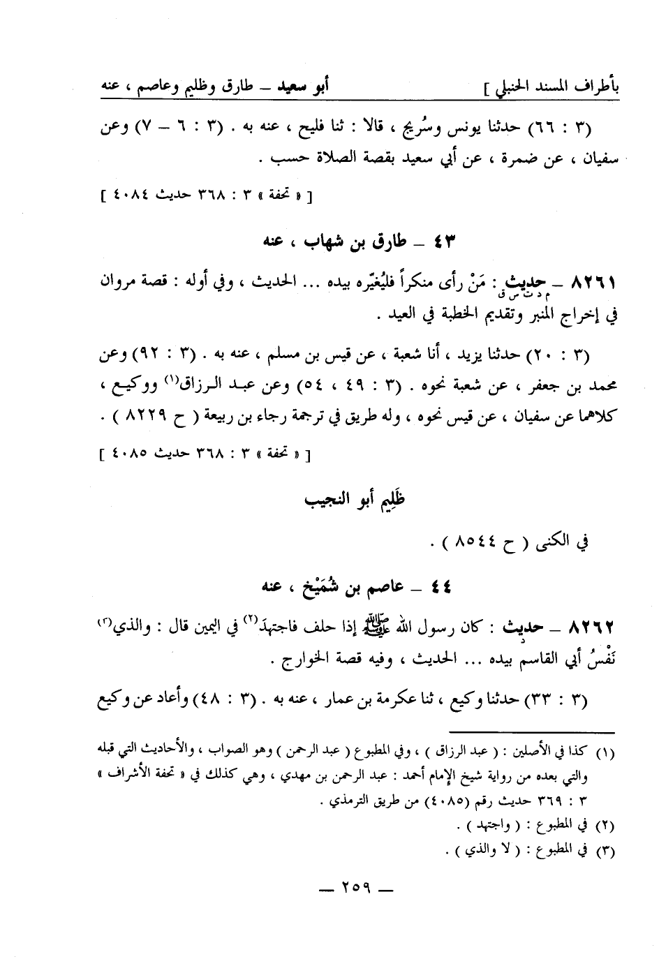8261 -[م د ت س ق] حديث: من رأى منكراً فليُغيّره بيده ... الحديث، وفي أوله: قصة مروان في إخراج المنبر وتقديم الخطبة في العيد. (3: 20) حَدَّثَنا يزيد، أنا شُعبة، عن قيس بن مسلم، عنه به. (3: 92) وعن محمد بن جعفر، عن شُعبة نحوه. (3: 49، 54) وعن عبد الرزاق ووكيع، كلاهما عن سفيان، عن قيس نحوه، وله طريق في ترجمة رجاء بن ربيعة (ح 8229) .