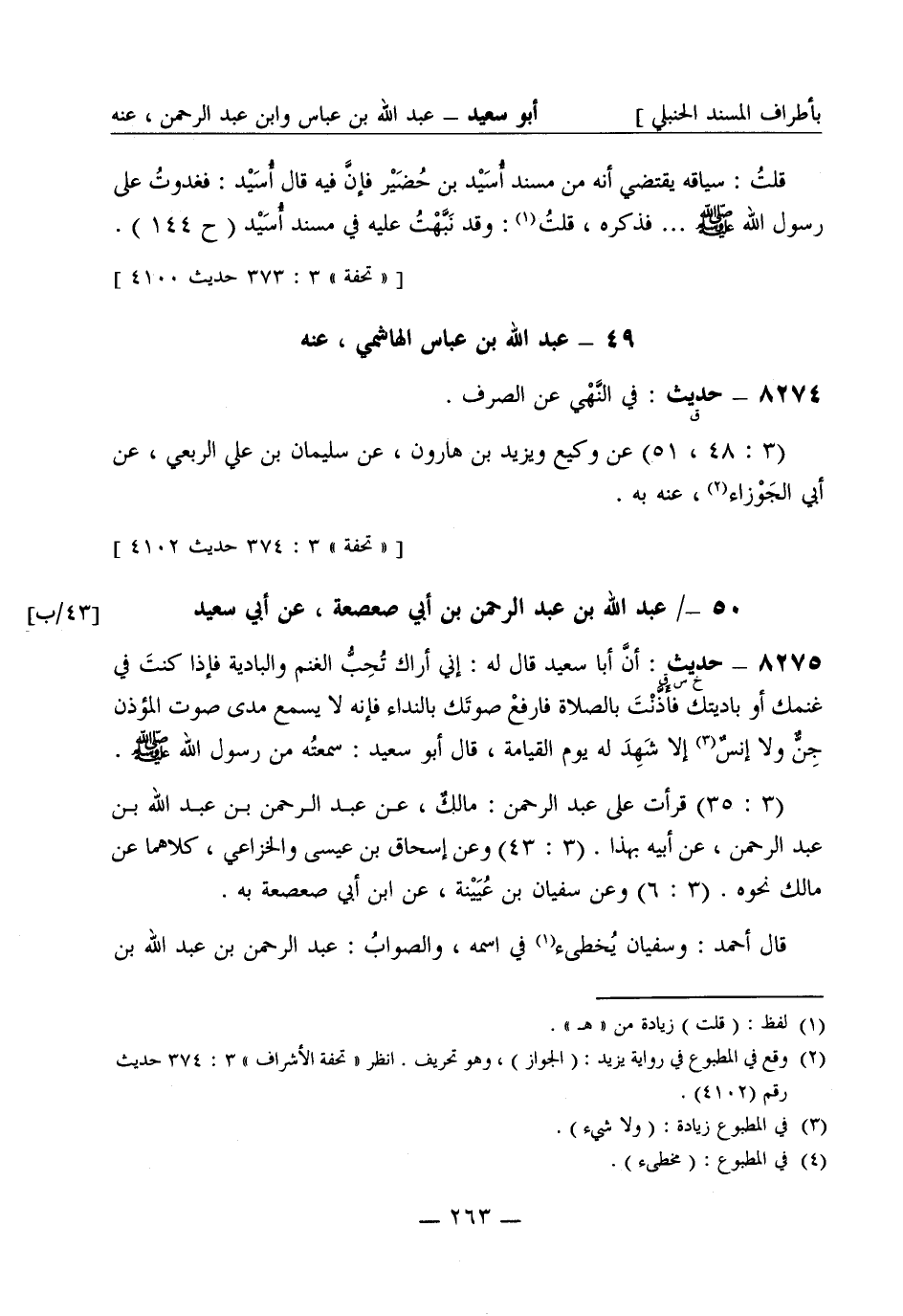 8275 -[خ س ق] حديث: أنَّ أبا سعيد قال له: إني أراك تُحِبُّ الغنم والبادية فإذا كنتَ في غنمك أو باديتك فأَذَّنْتَ بالصلاة فارفعْ صوتَك بالنداء فإنه لا يسمع مدى صوت المؤذن جِنٌّ ولا إنسٌ إلا شَهِدَ له يوم القيامة، قال أبو سعيد: سمعتُه من رسول الله صَلَّى اللَّهُ عَلَيْهِ وَسَلَّمَ. (3: 35) قرأت على عبد الرحمن: مالكٌ، عن عبد الرحمن بن عبد الله بن عبد الرحمن، عن أبيه بهذا. (3: 43) وعن إسحاق بن عيسى والخُزَاعي، كلاهما عن مالك نحوه. (3: 6) وعن سفيان بن عُيَينة، عن ابن أبي صعصعة به. قال أحمد: وسفيان يُخطئ في اسمه، والصواب: عبد الرحمن بن عبد الله بن -[264]- عبد الرحمن بن أبي صعصعة، يعني أنَّ سفيان يقول في روايته: عبد الله بن عبد الرحمن، عن أبيه.
